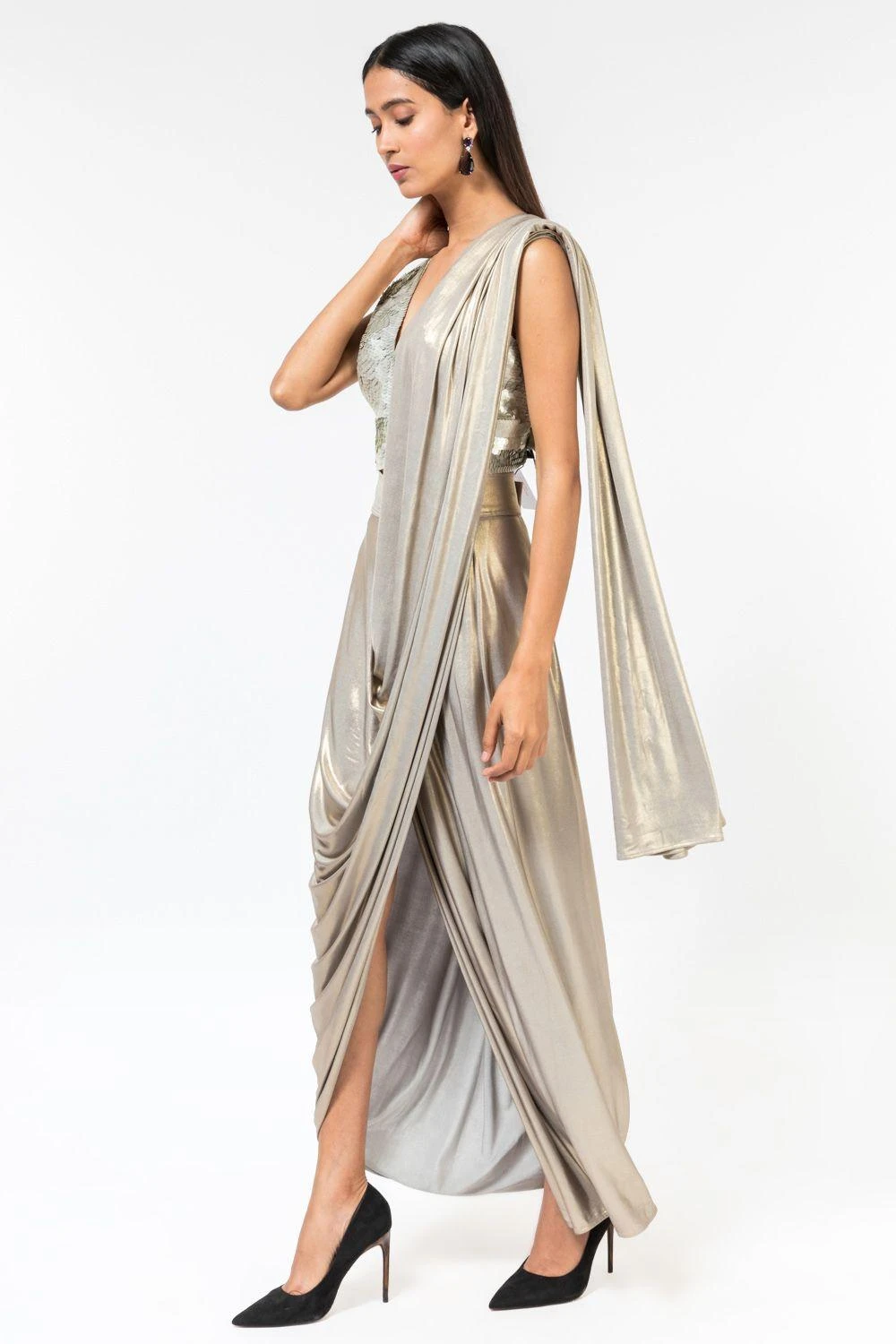 The opulence of this sequin top will offset the subtlety of an understated silk sari. The top is made in a silk base and heavily adorned with sequins. Style it with a jersey draped sari from the collection.
