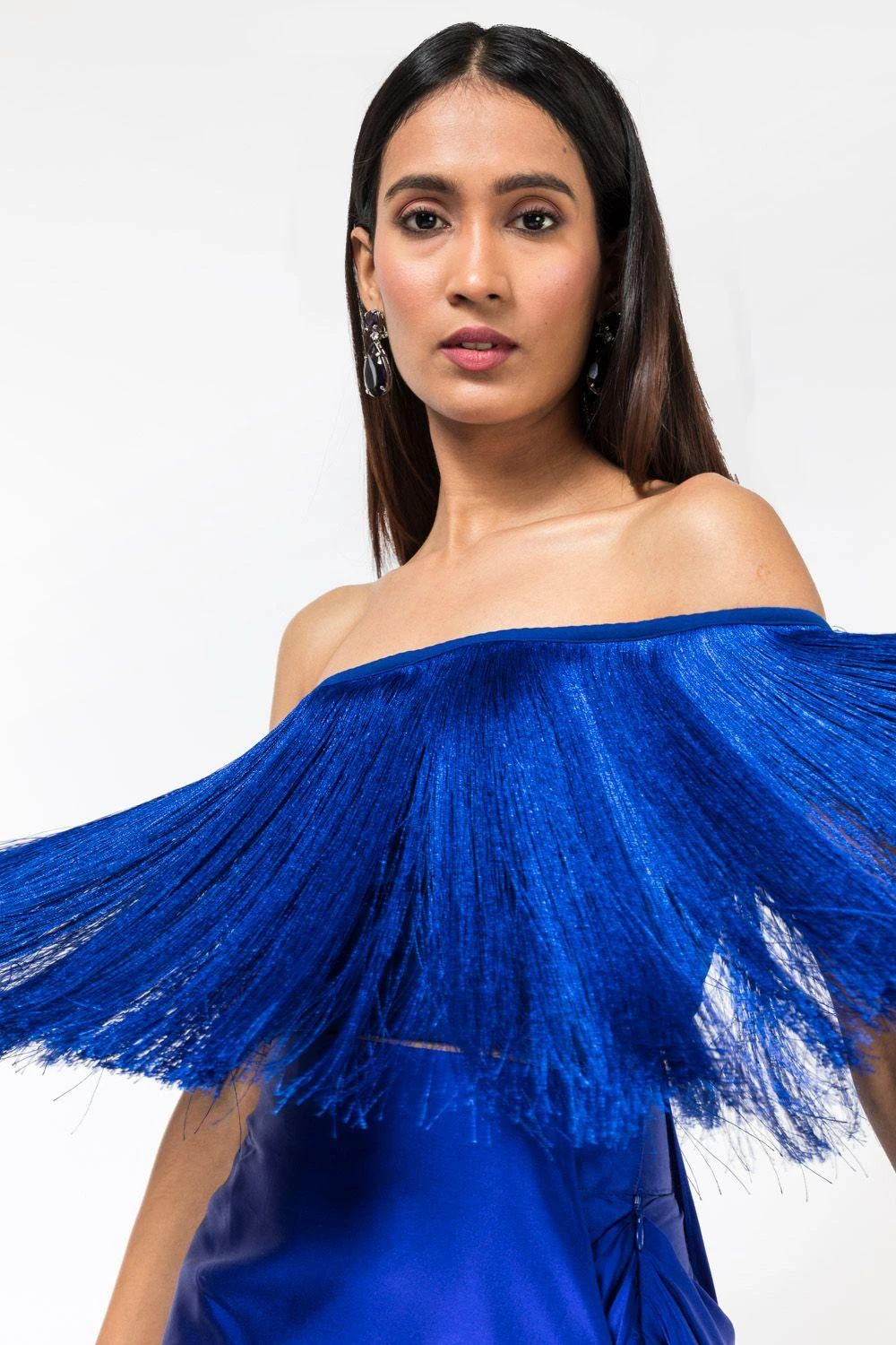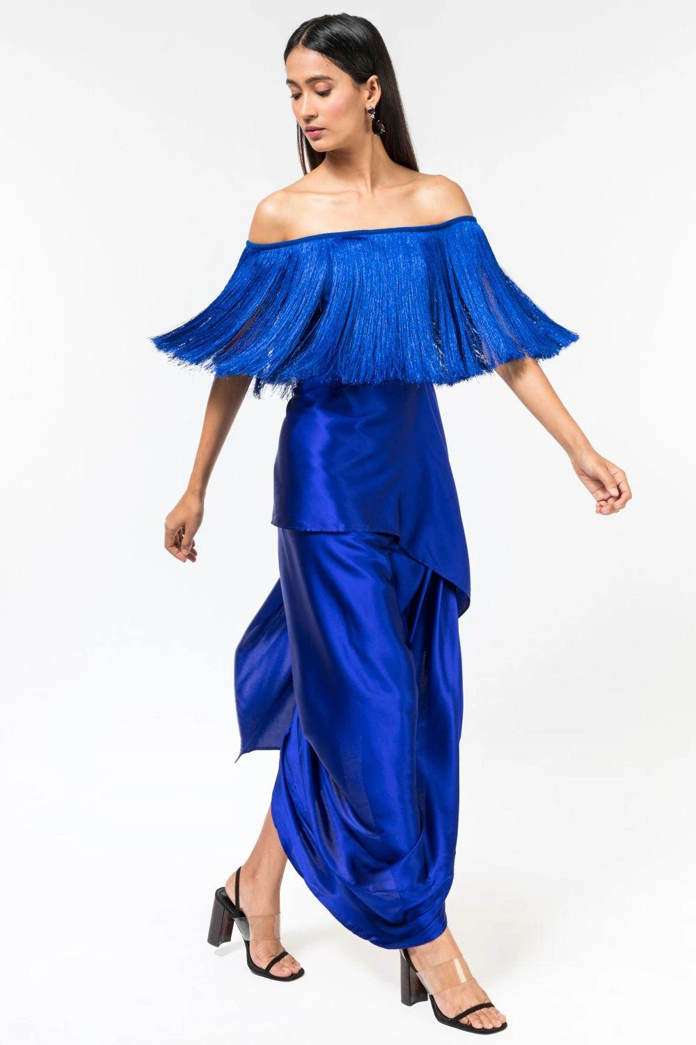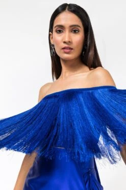 Go all playful & dramatic in this eclectic blue fringe crop top. It is made in satin base and accentuated with signature fringes. Style it with a coordinating blue skirt from the collection for a drinks night.