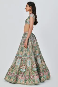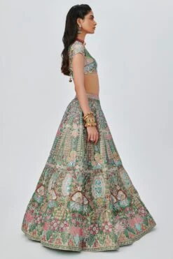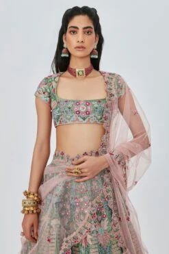 Immerse yourself in the vibrant beauty of this embellished and appliqued kali lehenga. This captivating ensemble, accompanied by a stunning blouse and a scallop dupatta, exudes sheer elegance. Revel in the mesmerizing allure of this masterpiece.