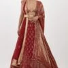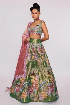Make an unconventional bride in this eclectic green lehenga. It is made in tissue base and adorned with applique & embellished vertical brocade panels. It is paired with an ornate blouse and tissue dupatta.