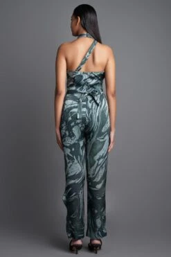 This asymmetric halter neck draped jumpsuit promises to set you apart from the crowd. It is cut in marble print flowy chiffon and features an extended front drape with a metallic tie-up. Style it with a pair of high heels and a statement clutch.