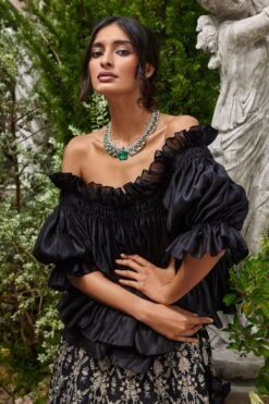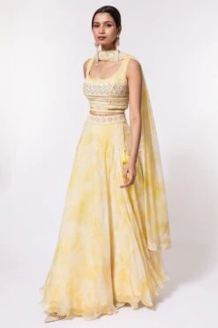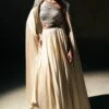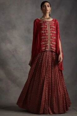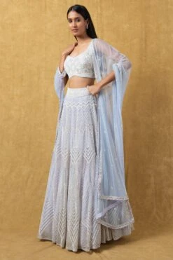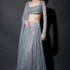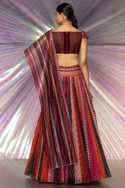The eclectic combination of colors coupled with Amit Aggarwal’s structural silhouette is nothing short of magnificent. This plisse flowy starburst lehenga comes along with a hand embroidered moulded metallic blouse and a structured drape.