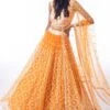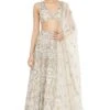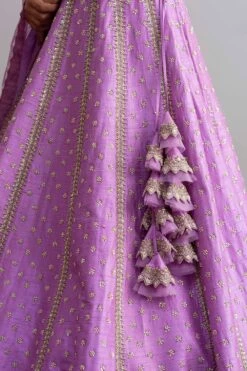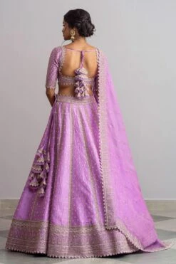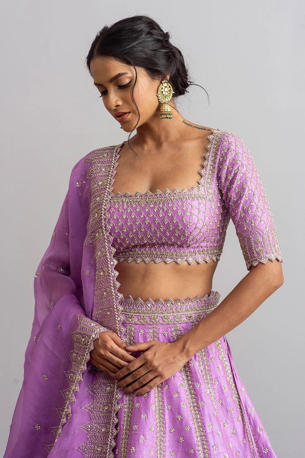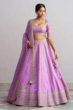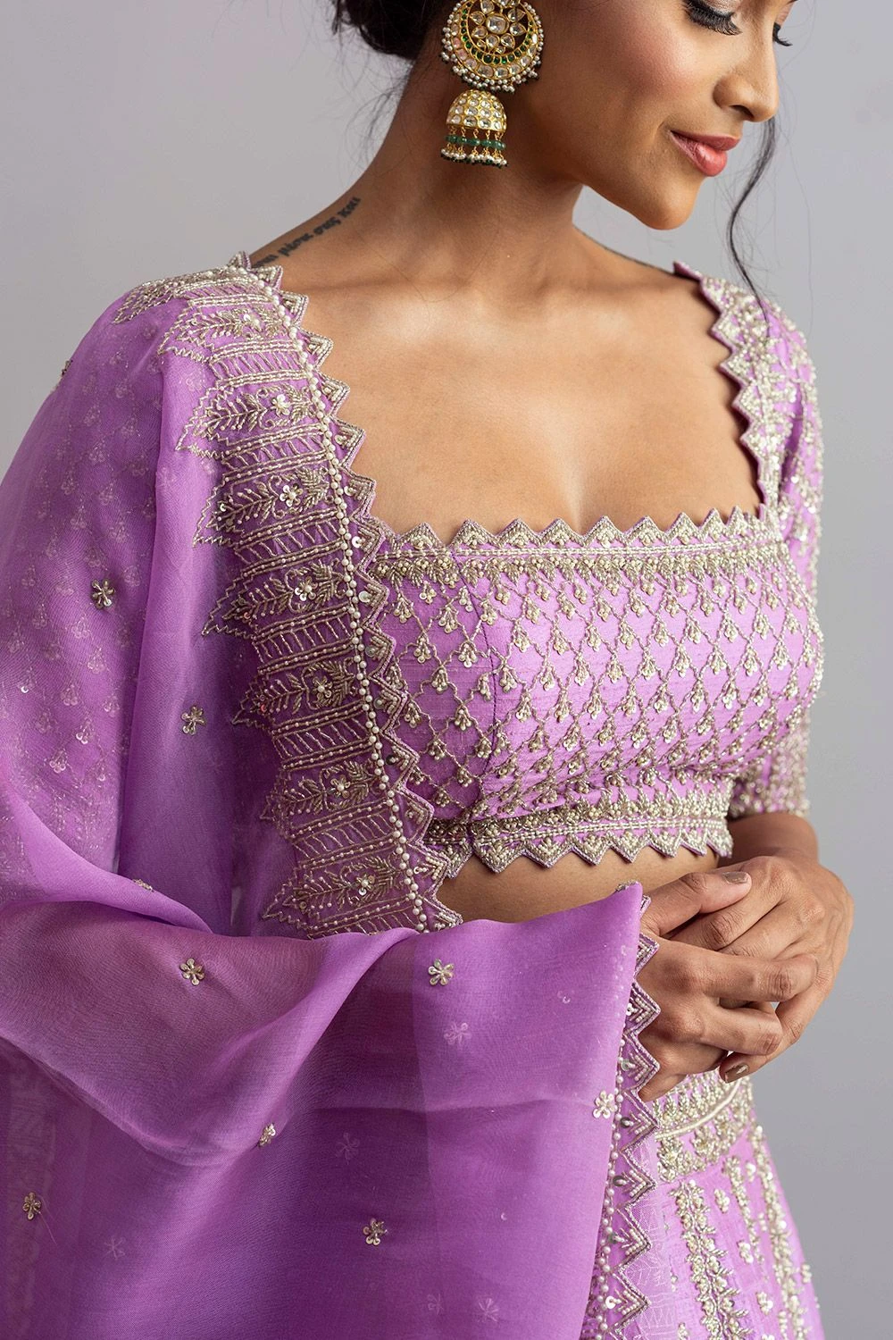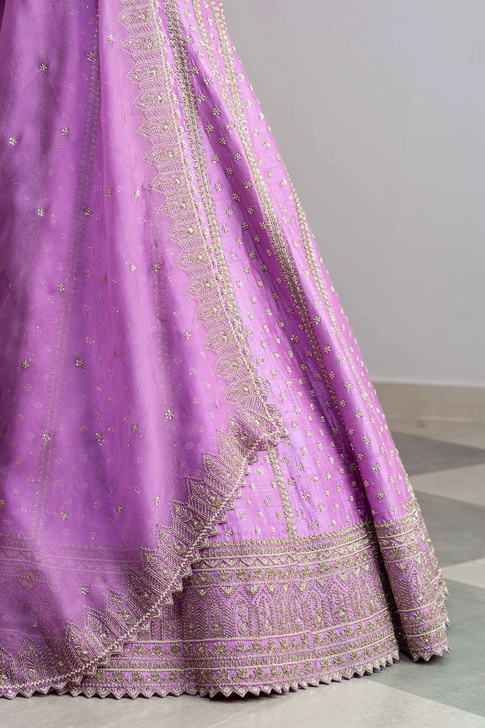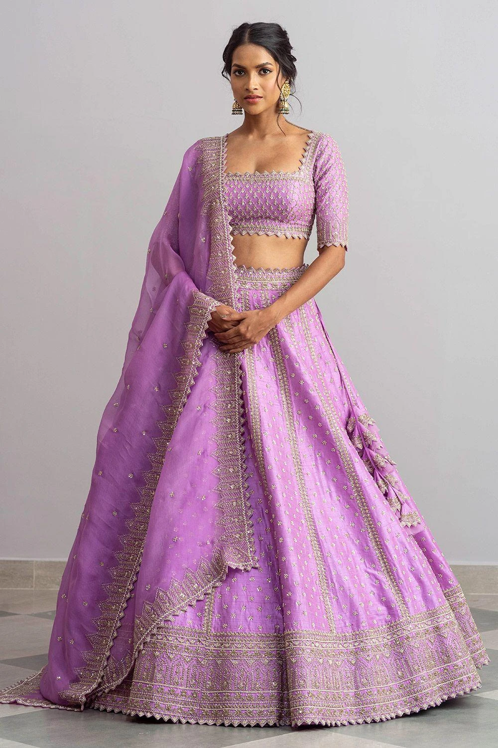 For the modern day brides, this lavender embellished lehenga set is a refreshing & youthful choice. It is made in a raw silk base and adorned with cutdana embroidery. It is paired with a matching organza dupatta.