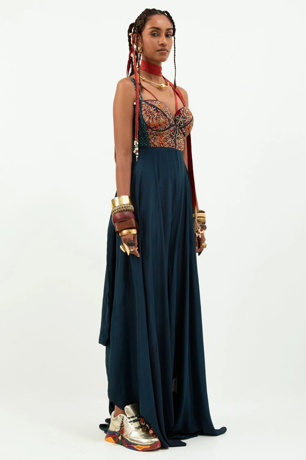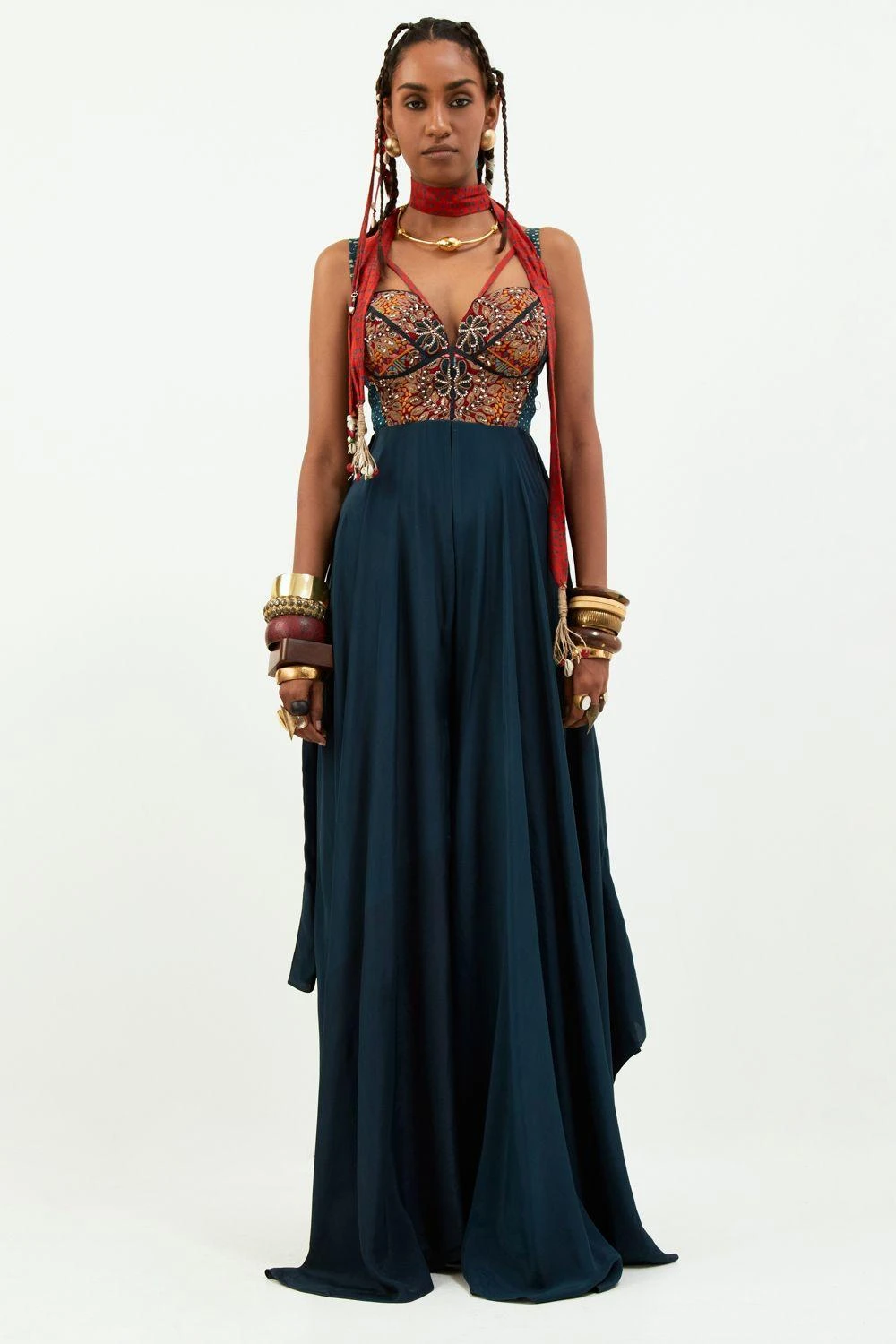 Indulge in the artistry of this embroidered jumpsuit. The Zari Marodi embroidery showcases intricate craftsmanship, elevating this piece to sheer opulence. With its stylish design, this jumpsuit is a statement of elegance and sophistication.