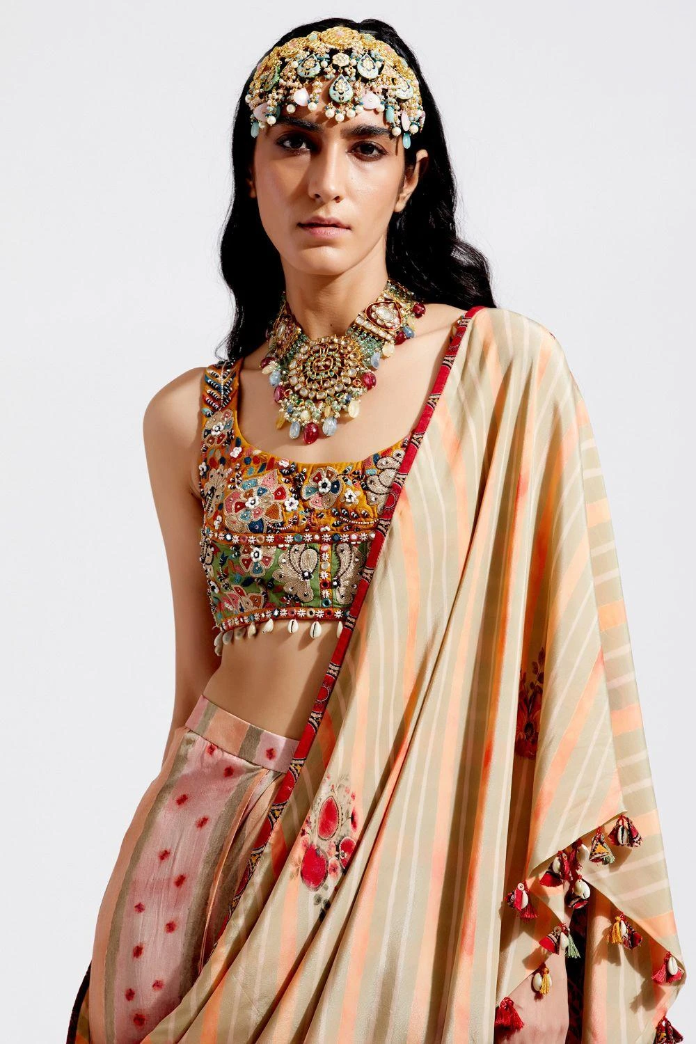 This sleeveless kalpa blouse will add the perfect amount of boho glam to your festive looks. It is cut in a raw silk base and highlighted with intricate embroidery & cowry shells. Pair it with a drape sari from the collection.