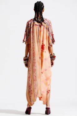 For a holiday or a festivity, this textured printed jumpsuit will suit all your moods. It is cut in natural crepe fabric in a relaxed dhoti style silhouette and highlighted with bohemian embroidery on the neckline. Style it with a pair of danglers.