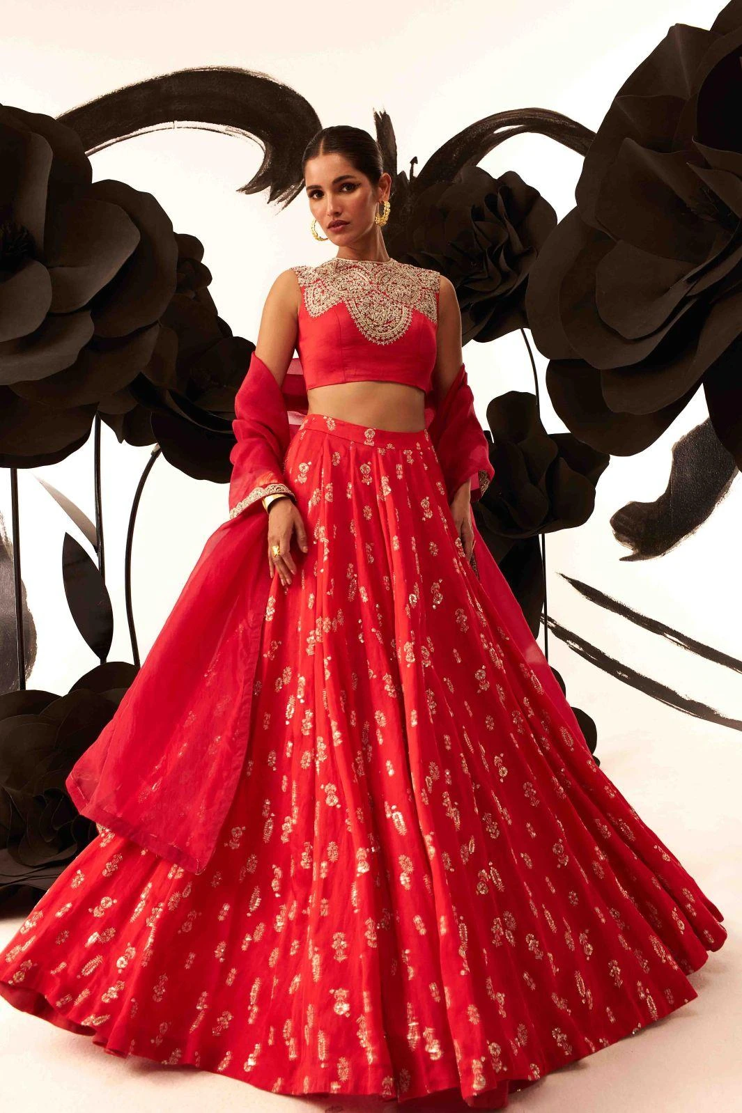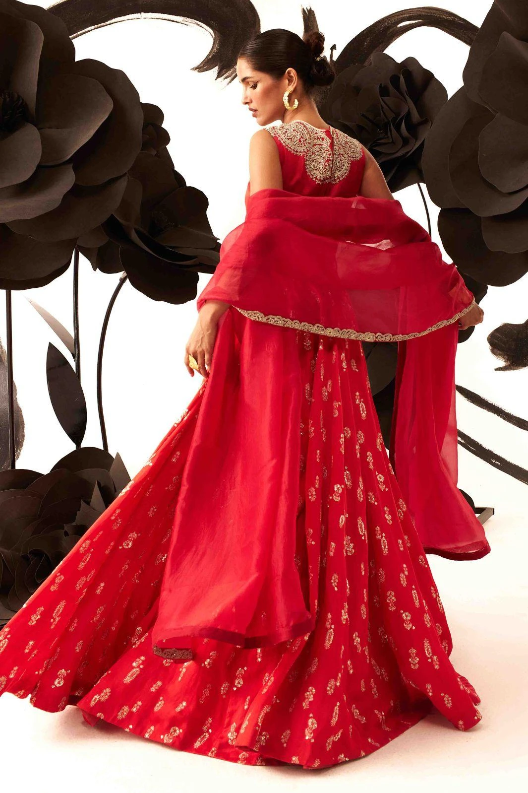 Radiate sophistication in this red floret skirt, gracefully paired with an embroidered blouse and a matching dupatta. This ensemble embodies timeless elegance and style.