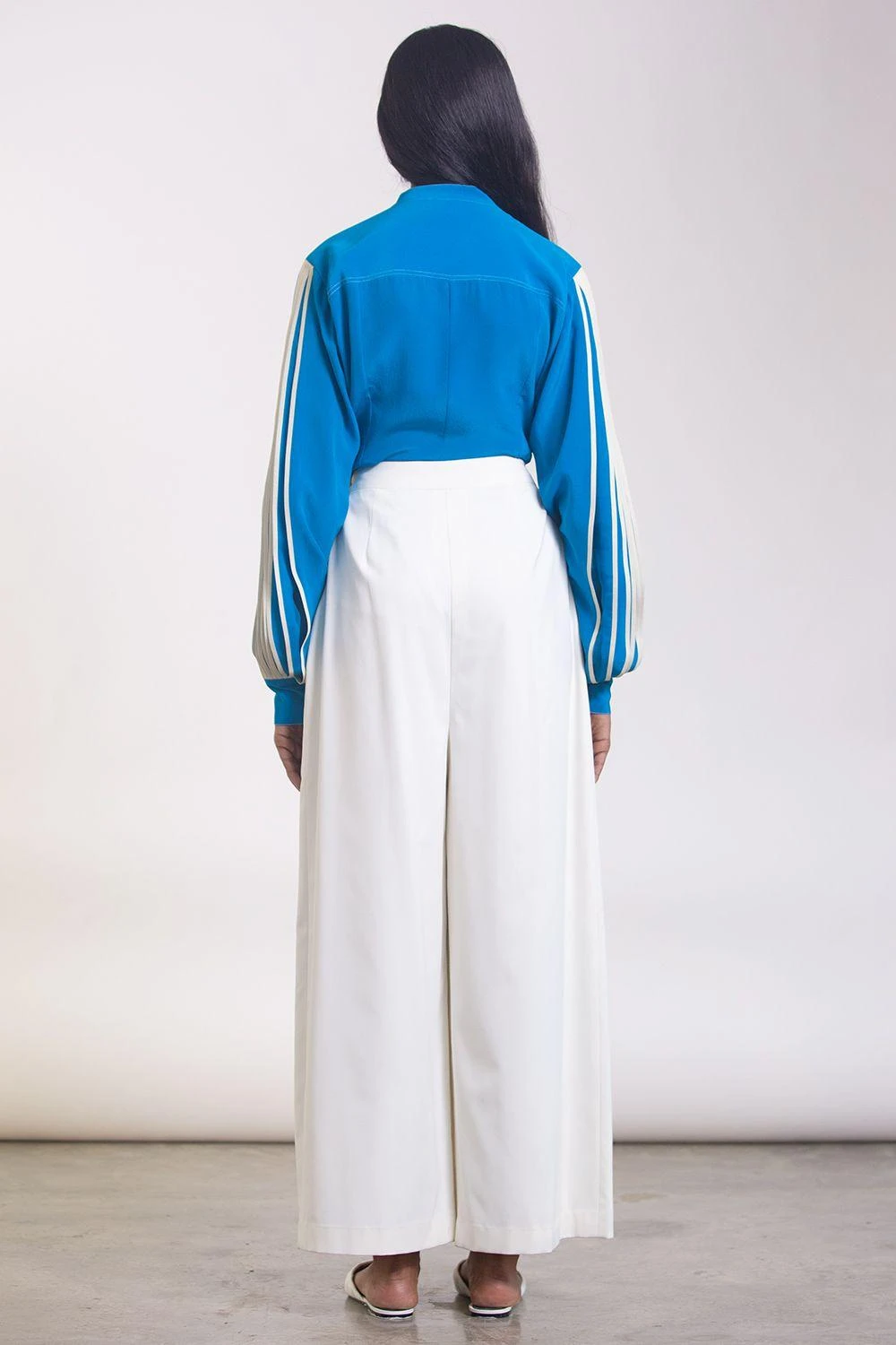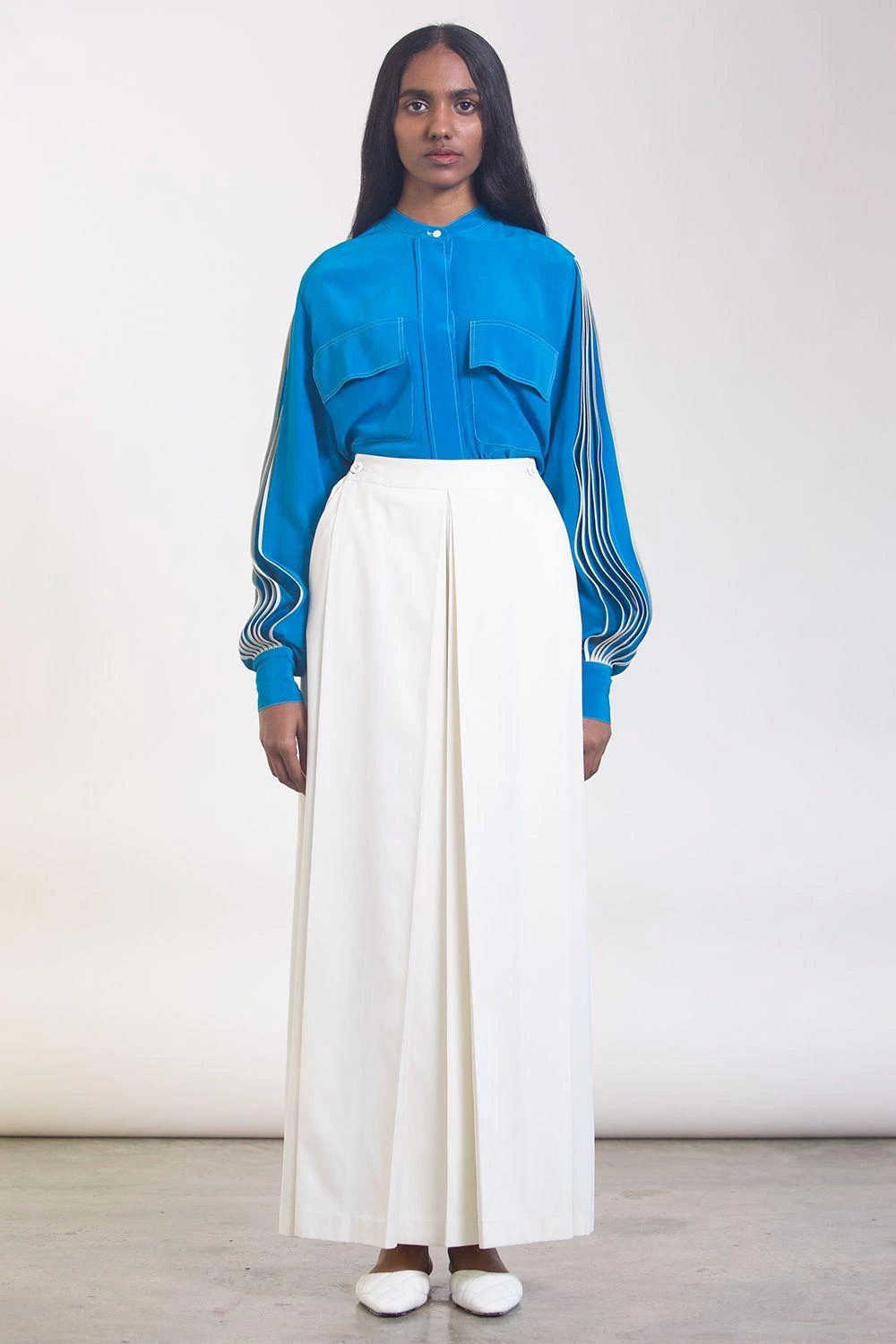 This band collar button down shirt is a basic style with edgy detailing. Look for the front flap pockets and bound pleating on sleeves! Pair it with formal pleated trousers or a pencil skirt for a business meeting.