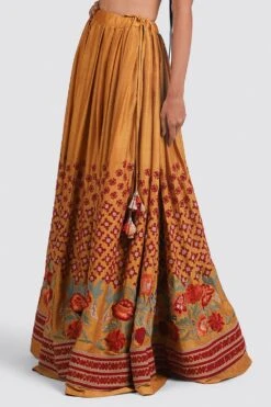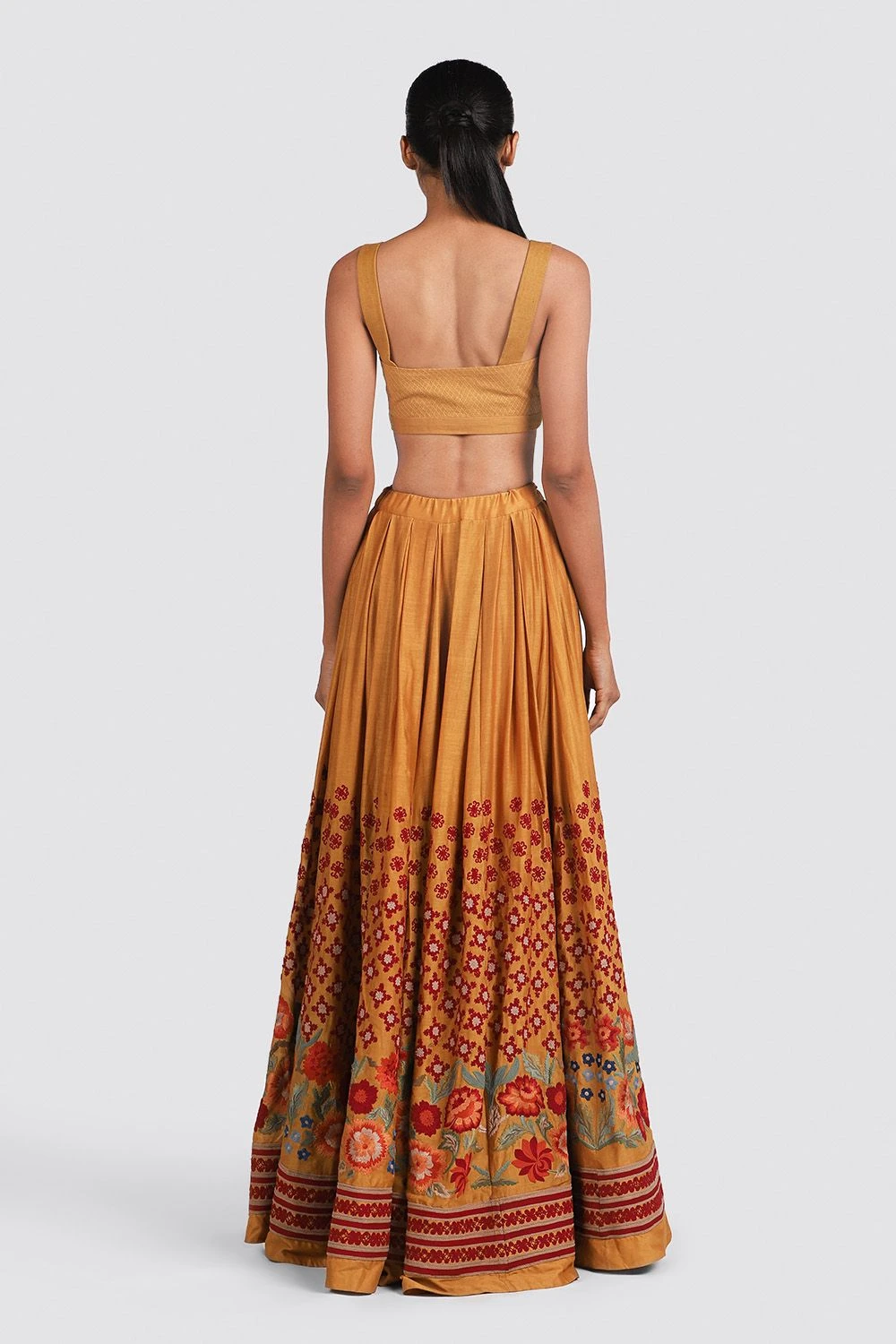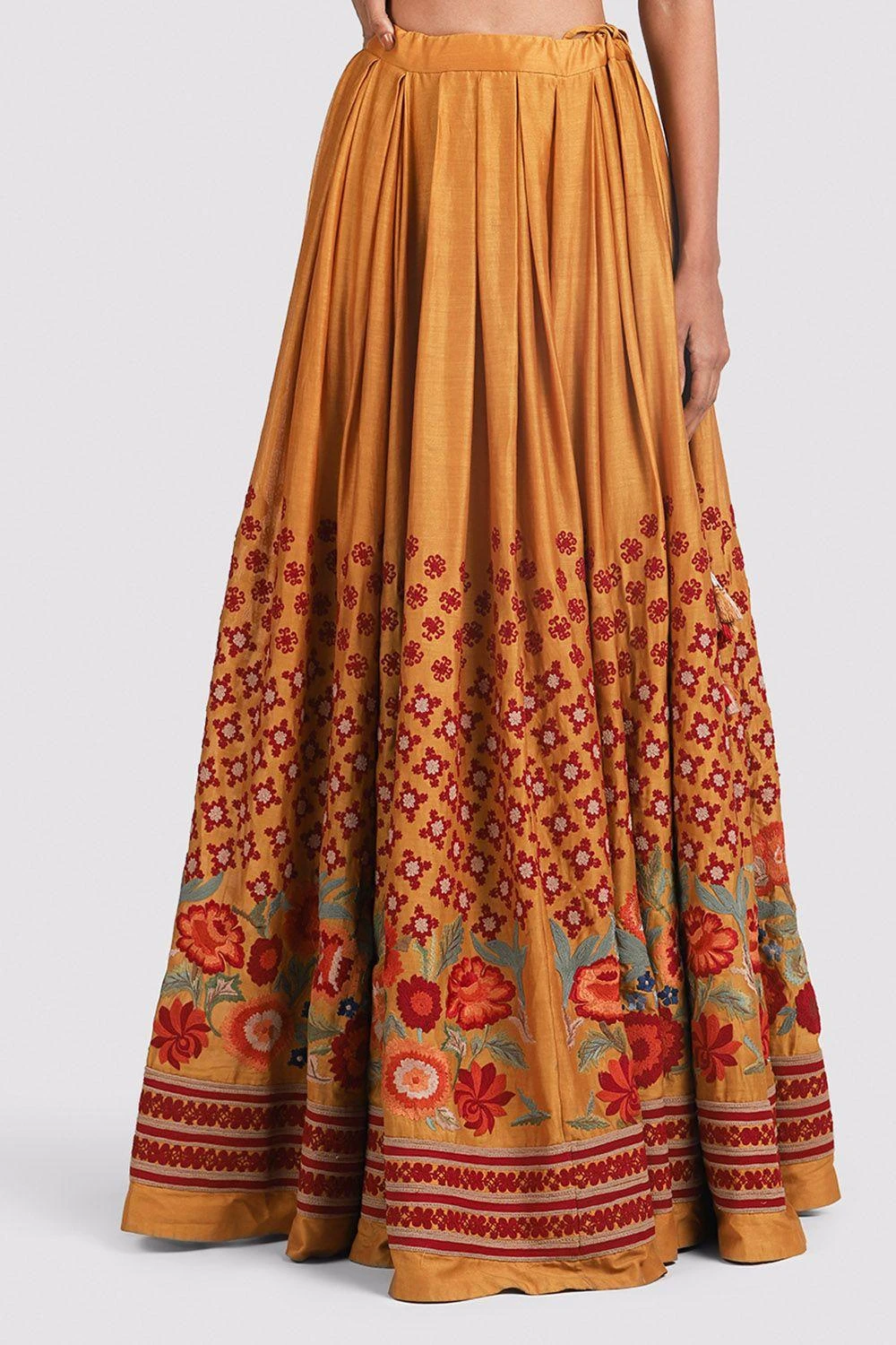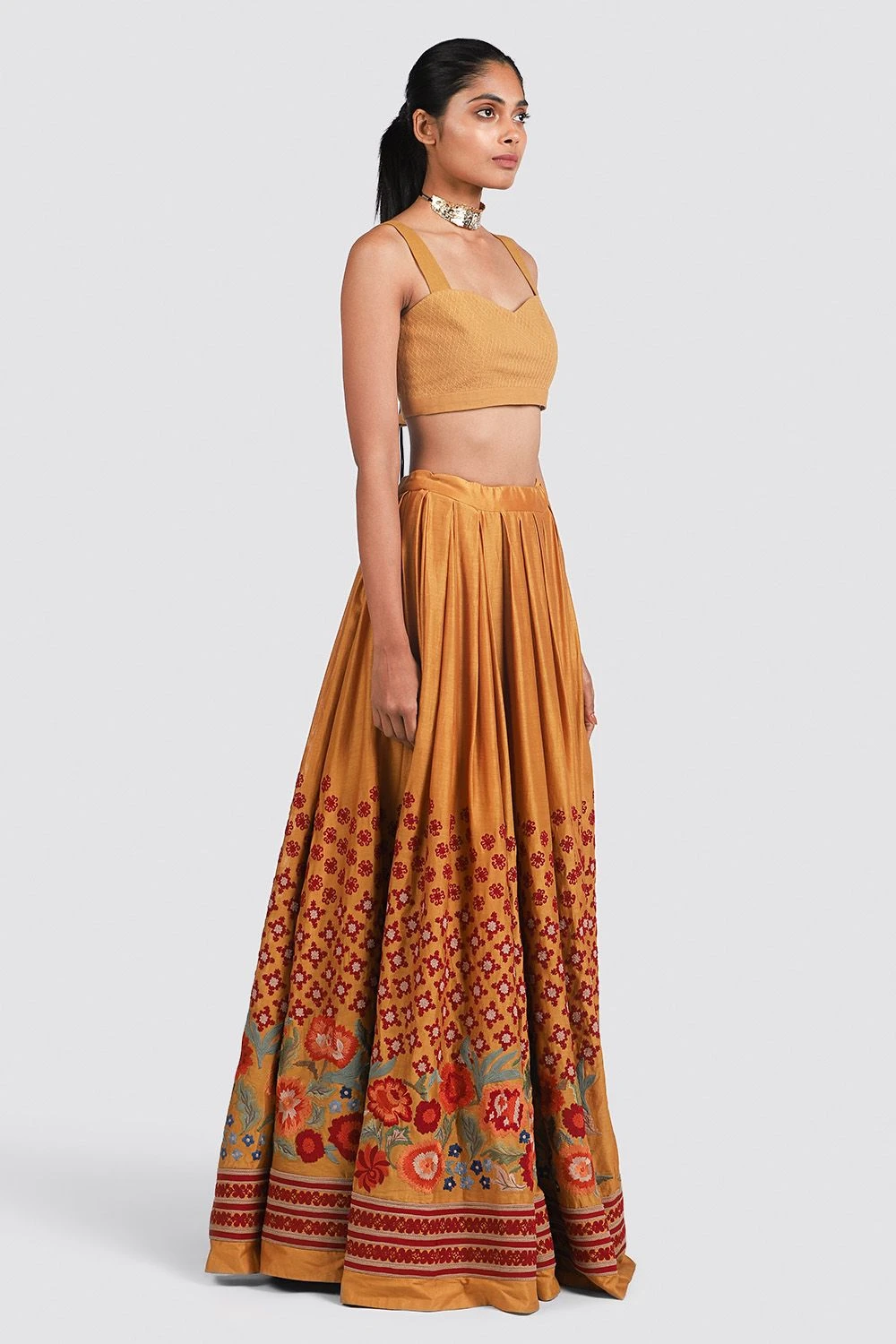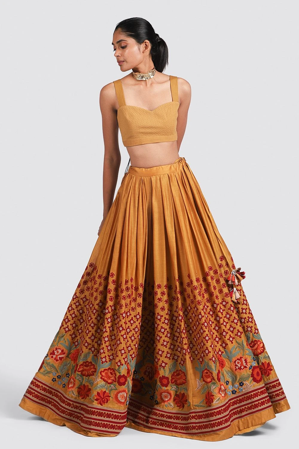 This pleated mustard lehenga will be your go-to option for all haldi and mehendi ceremonies. Pair it with a red shirt and a jadau necklace to make a statement!