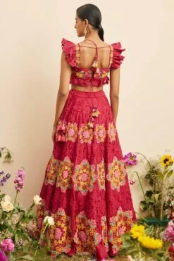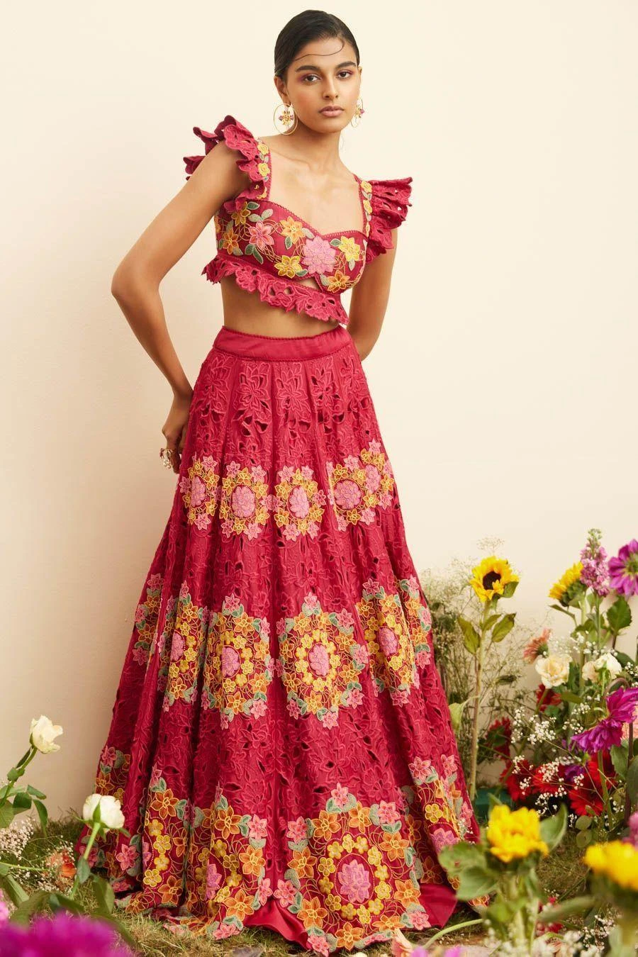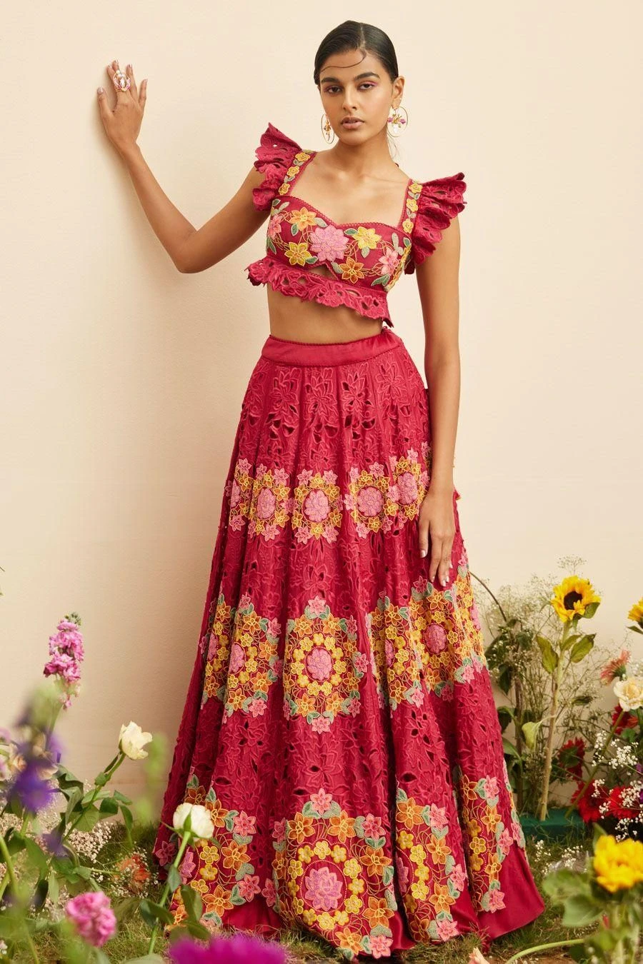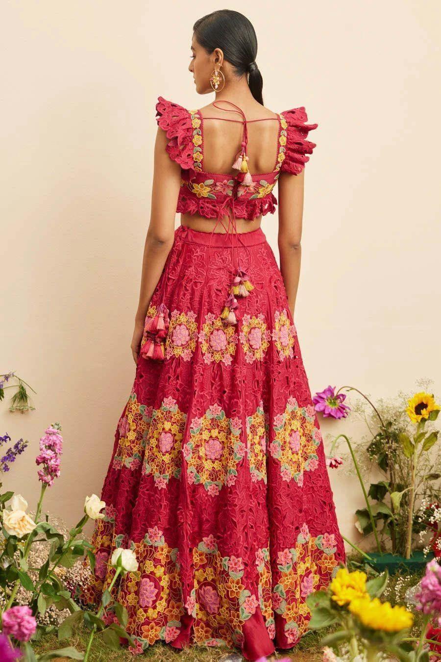 Maximise the life of your wardrobe with this bustier. Crafted in chanderi, this bustier features intricate beadwork & cutwork details. Pair it with the Fuchsia beadwork and cutwork lehenga from the collection for an effortless daytime look.