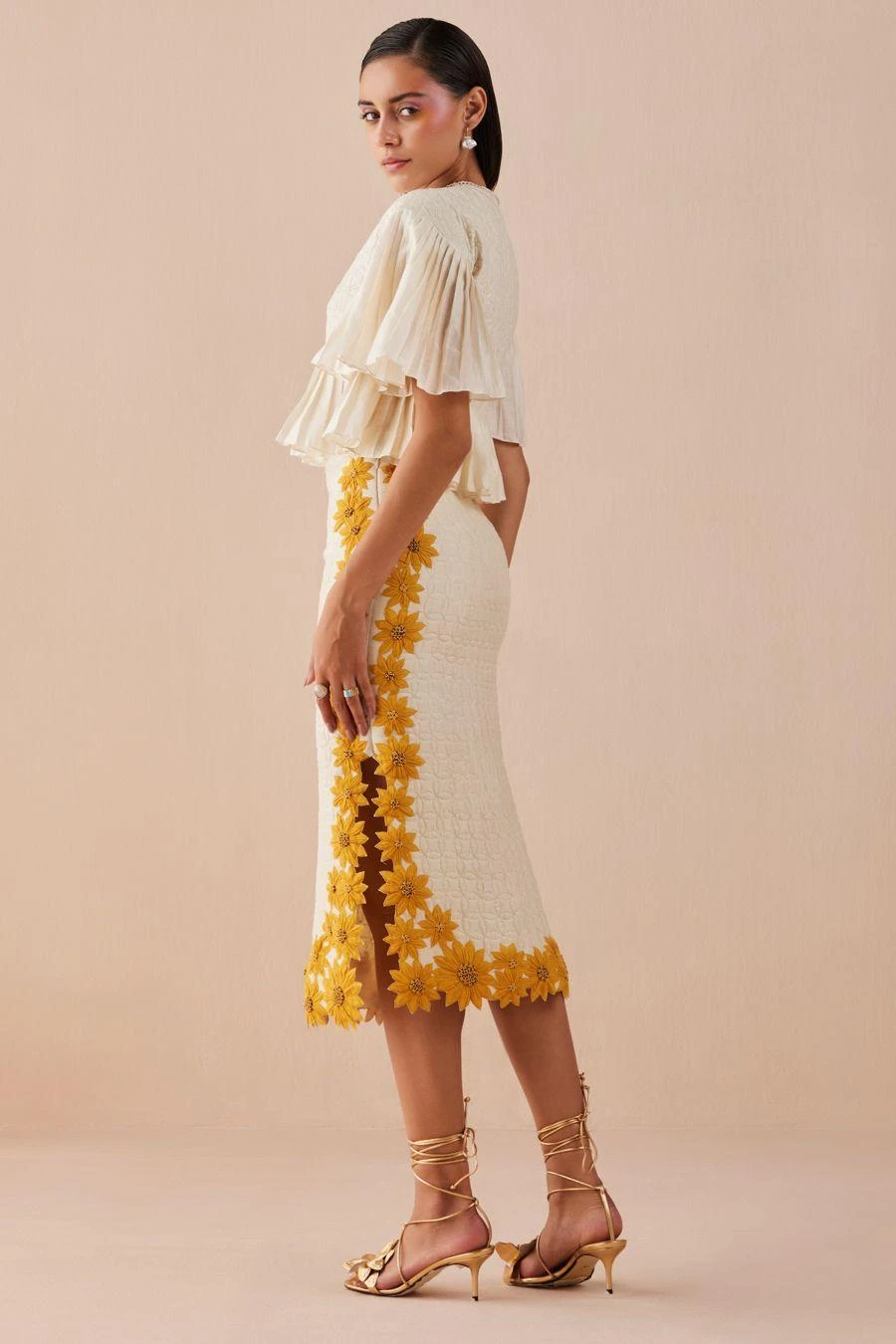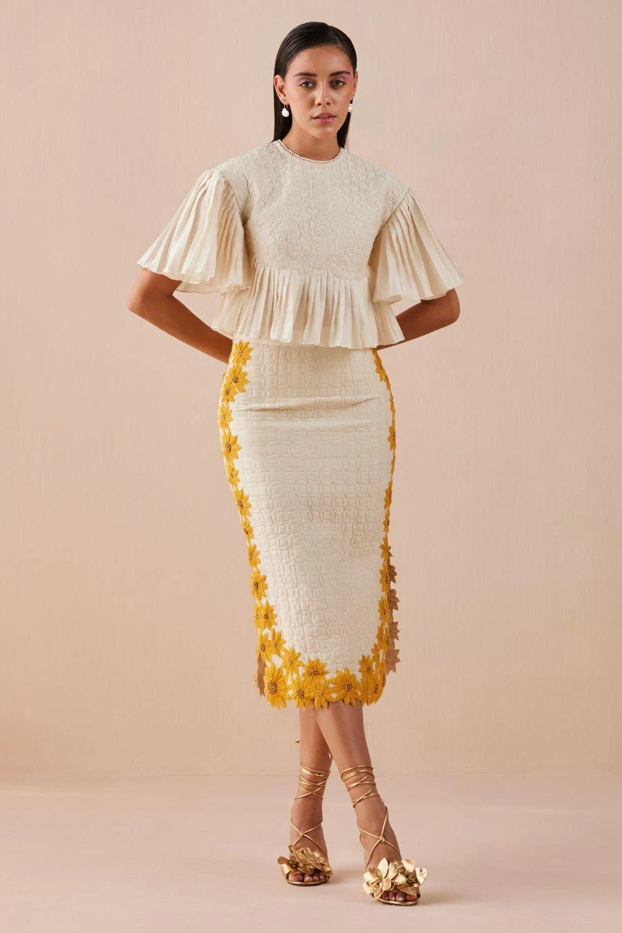 Whizz from the boardroom to the bar with this ivory top. Crafted in chanderi, this quilted short peplum top features pleated sleeves and hem. Pair it with the Ivory quilted sunflower midi skirt from the collection to complete the set.