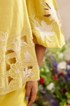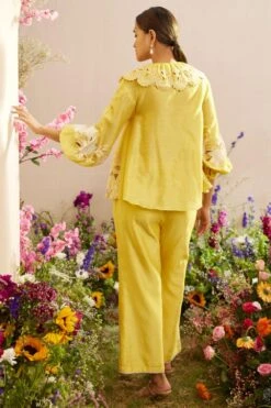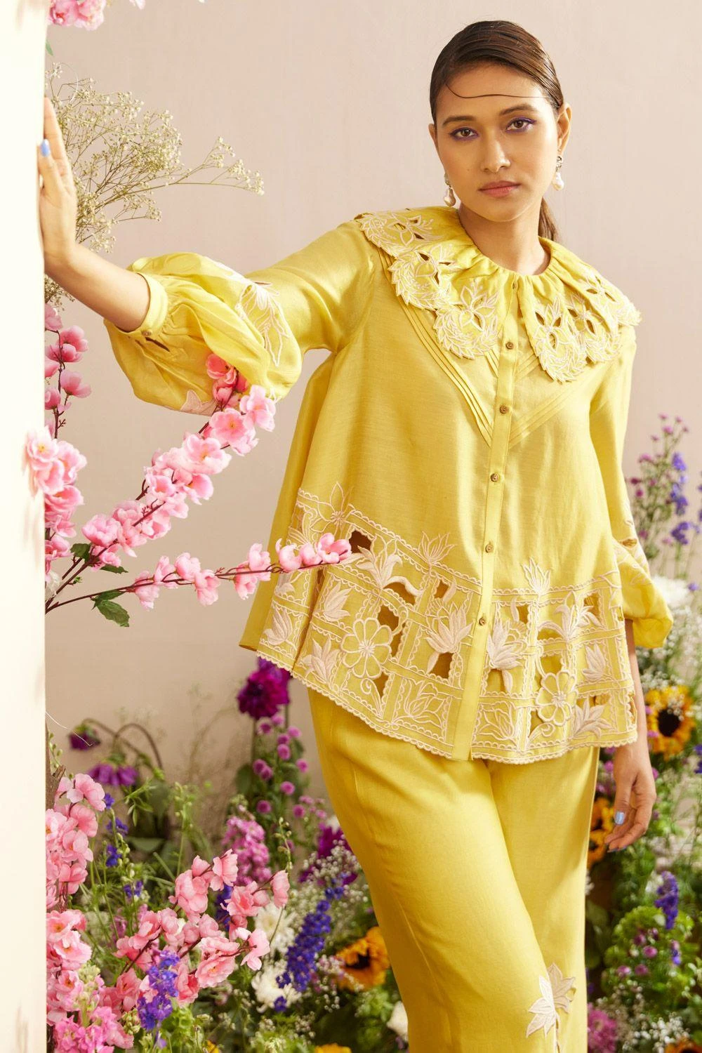 Elevate your style with this yellow chanderi contrast applique and cutwork shirt. The meticulous detailing and exquisite contrast appliquÒ work transform this shirt into a work of art, capturing the essence of refined elegance.