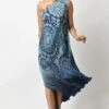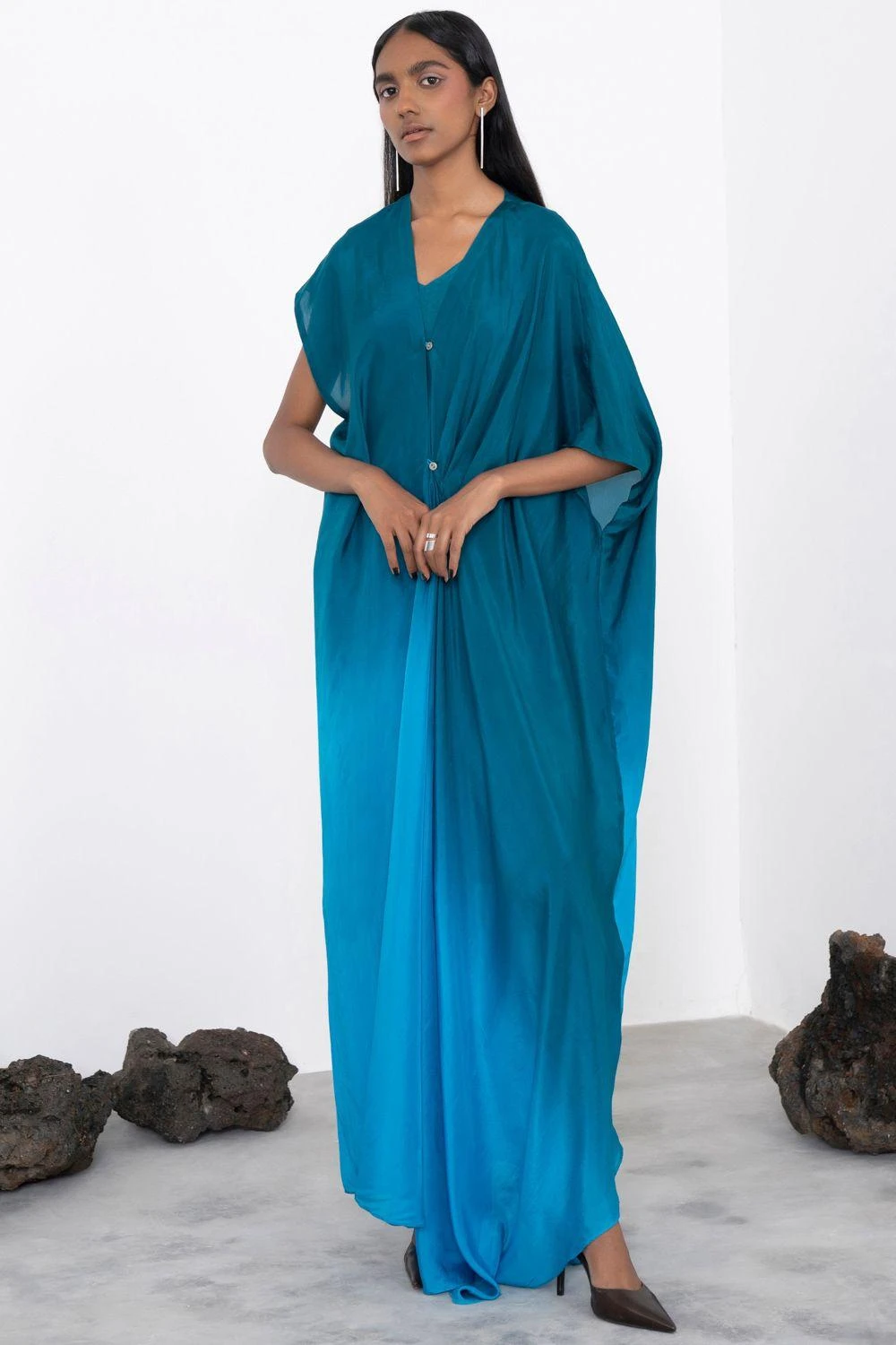 Indulge in sheer comfort & luxury with this blue ombre dress. It is cut in sumptuous satin for a butter smooth touch next to your skin and draped asymmetrically with a front button closure. This versatile piece can be worn in a variety of ways.