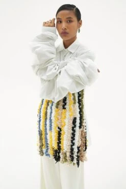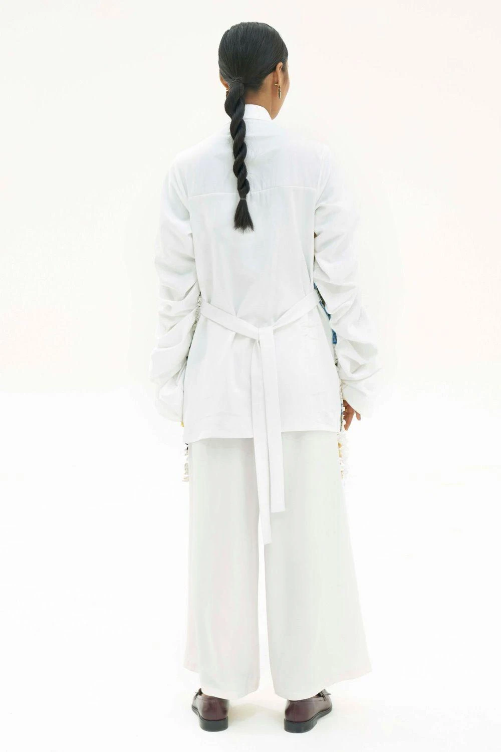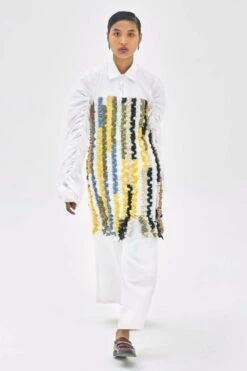 This stylish shirt is stitched from leftover fabric, forming frills over a plain white shirt. It features voluminous sleeves with gathers running over the length of it. Style this chic piece for dressy daytime events.