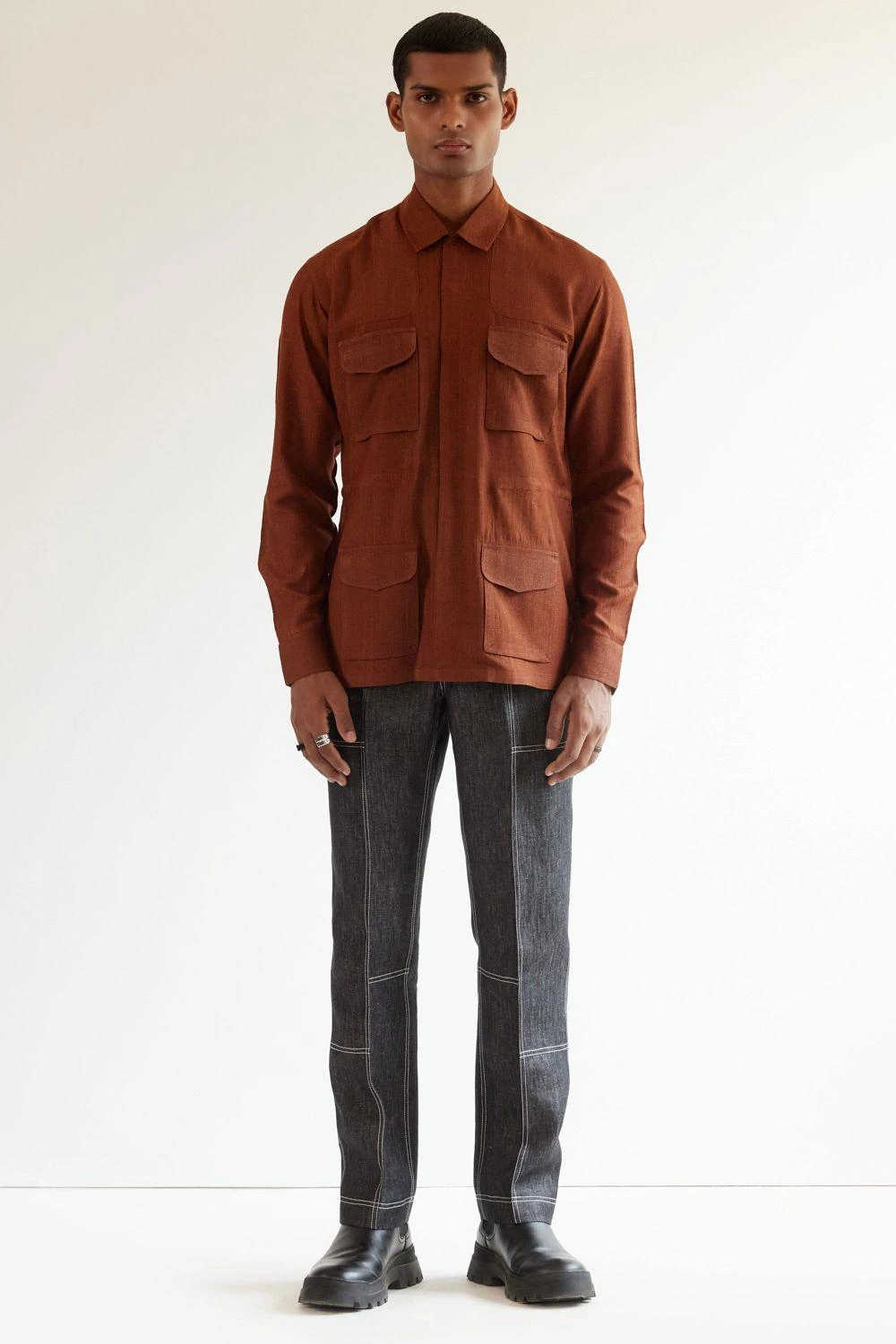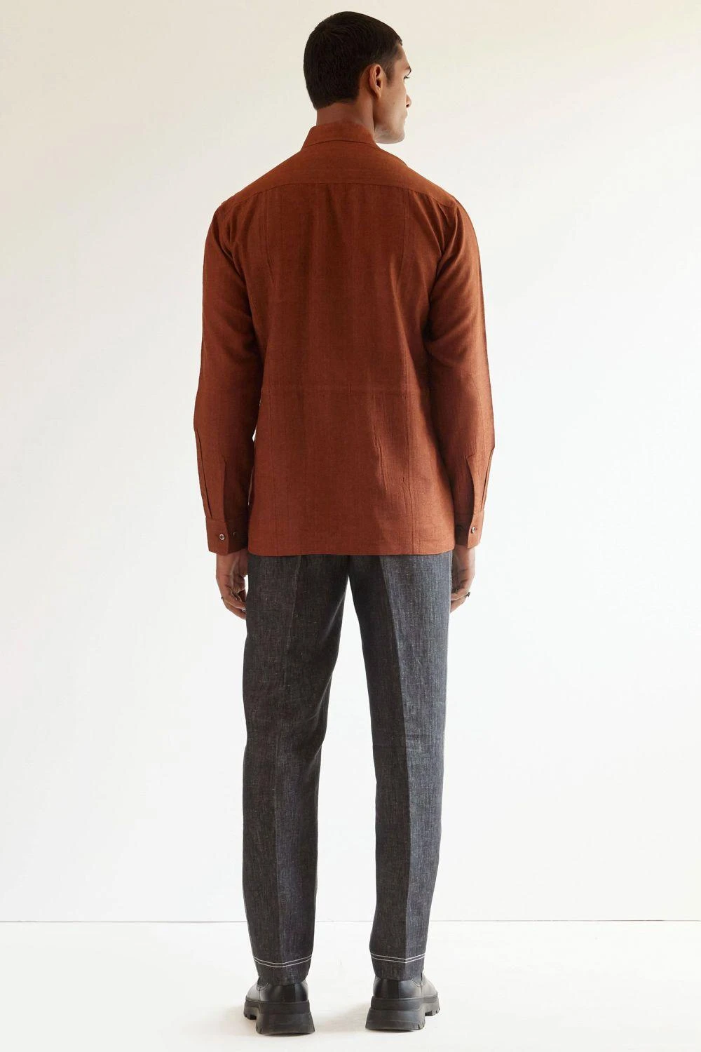 This Copper silk safari shirt crafted in linen is perfect for the balmy season. You can style this eclectic piece with a pair of navy pants or denims for a Sunday brunch.