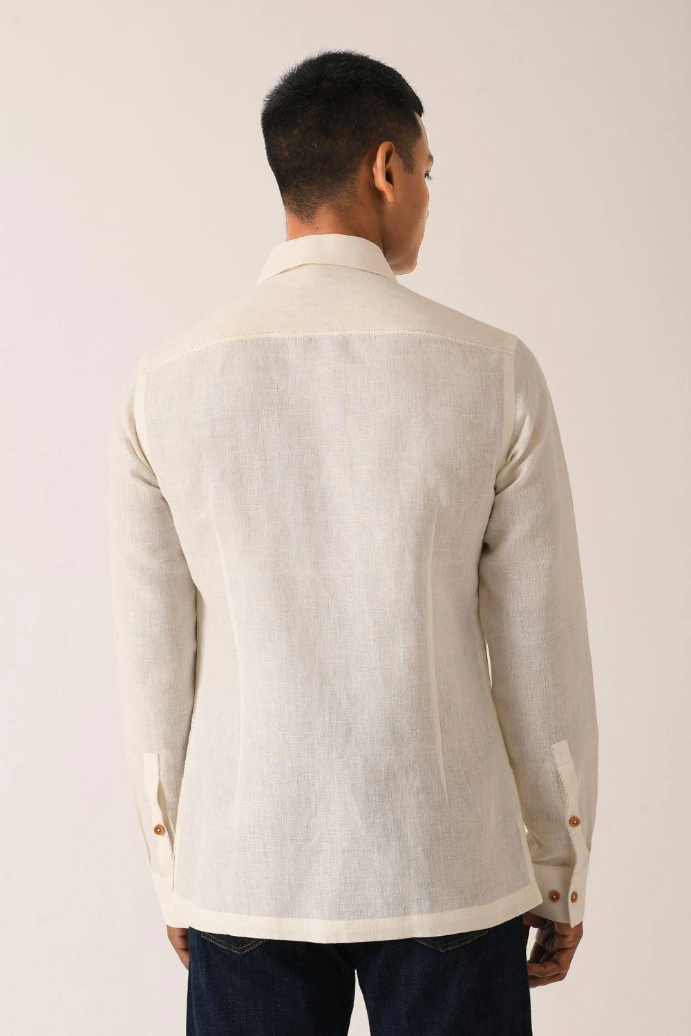 This classic cream shirt can be worn from day to evening effortlessly. It is cut in handloom cotton with stitch lines and features two side pockets, adding character to this piece.