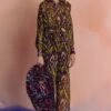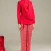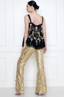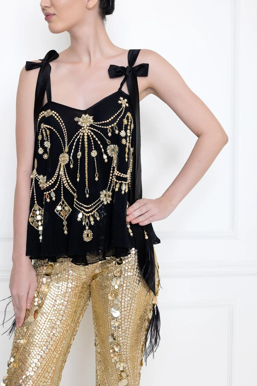 This statement camisole will make dressing up for any evening party a breeze. Crafted in net & viscose georgette, it is embellished with mirrors, feathers & pearls. Style it with a pair of flared trousers from the collection to complete the look.