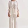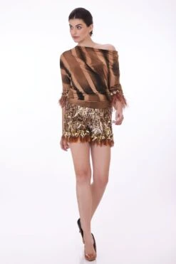 Indulge in opulence with the brown tie & dye draped top, adorned with feather-fringed cuffs, meticulously crafted in Lycra. A sartorial masterpiece designed for lavish affairs, ensuring you exude style and captivate every gaze. Command the spotlight.