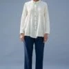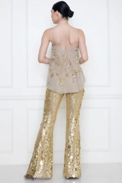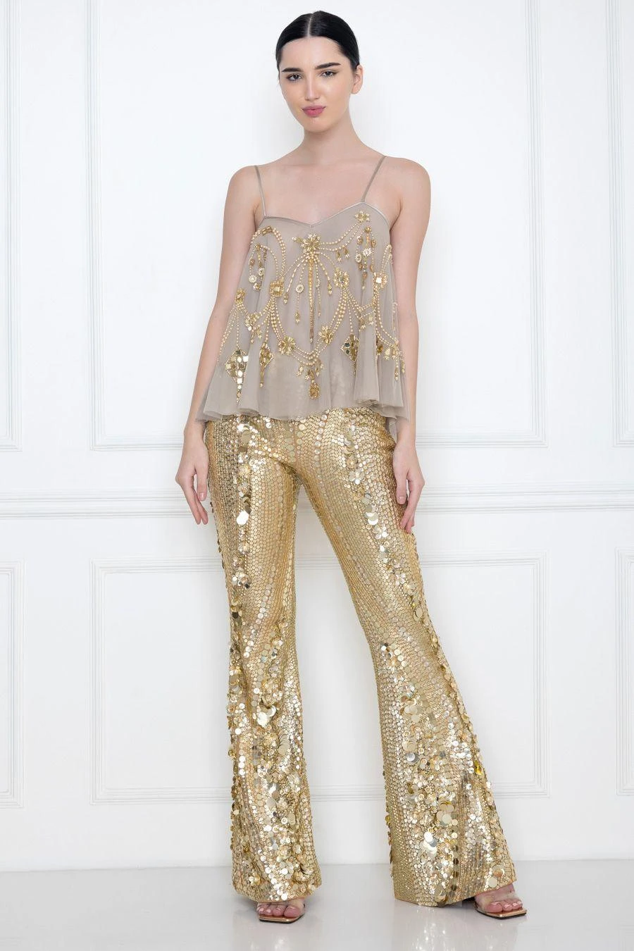 This statement camisole will make dressing up for any evening party a breeze. Crafted in net & viscose georgette, it is embellished with mirrors, feathers & pearls. Style it with a pair of flared trousers from the collection to complete the look.
