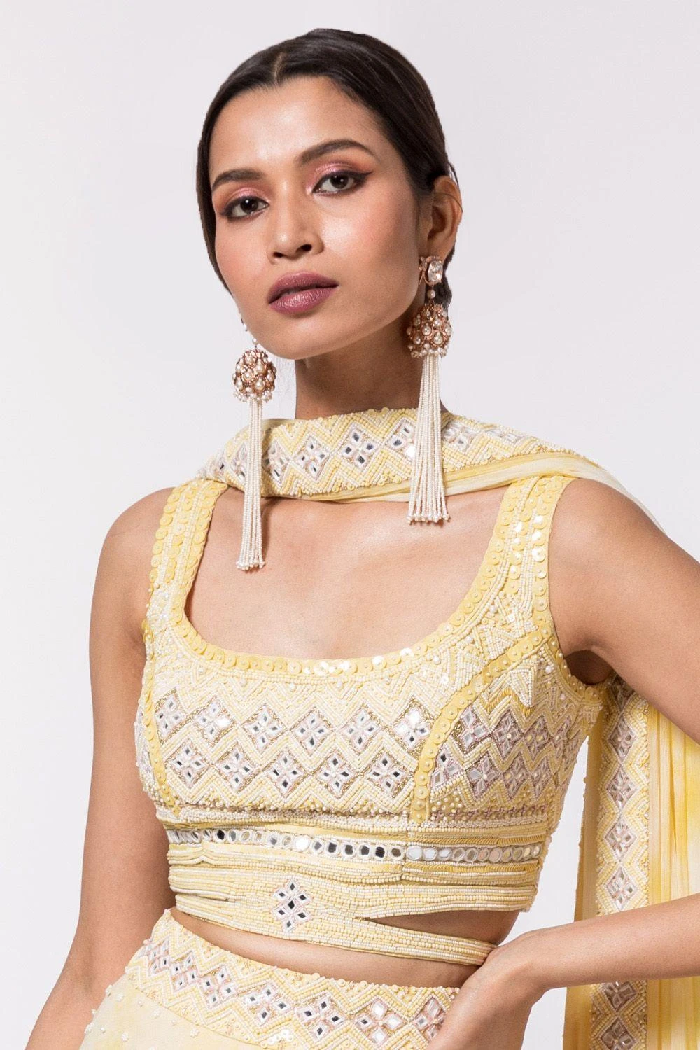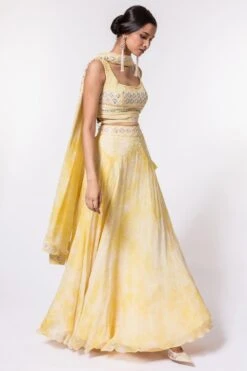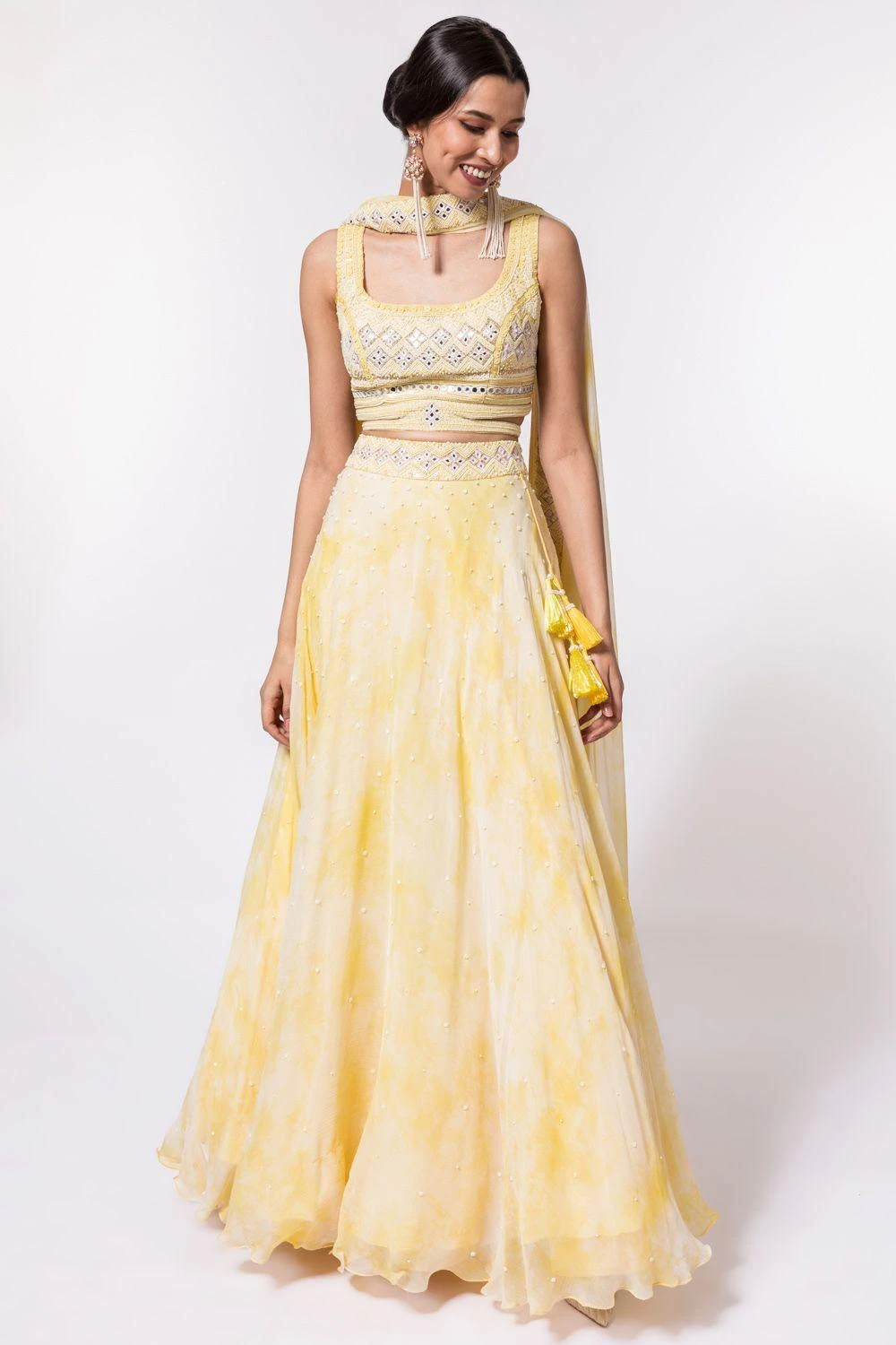Look like a breath of fresh air at your summer celebrations in this light yellow lehenga set. It features a tie-dyed chiffon lehenga with subtle butti embroidered and a waistband, paired with an embroidered bustier and a dupatta.