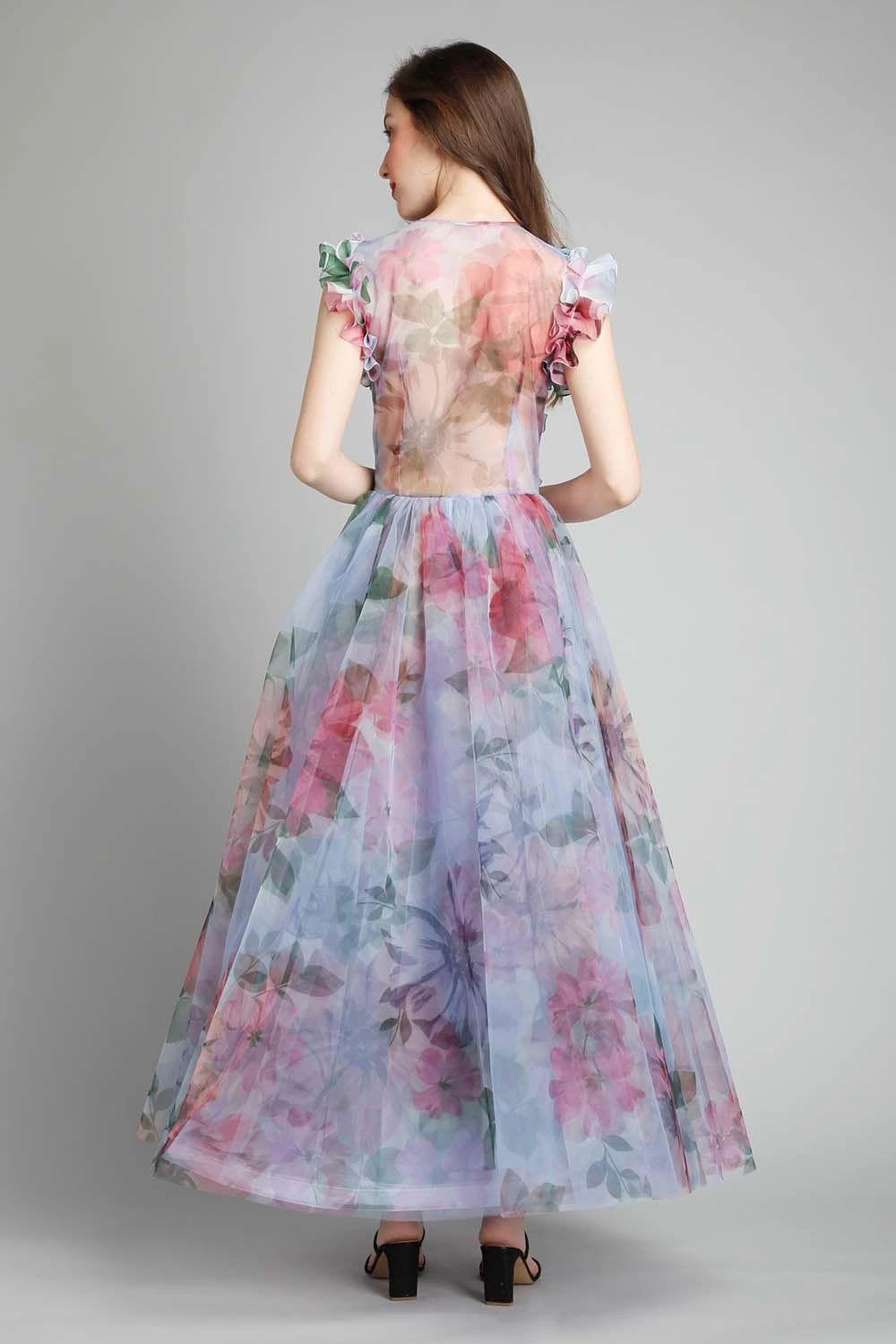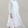 A concoction of everyday silhouettes in a couture structure. This midi dress features a shirt collar with overlapping frills and ruffles. The bodice is elongated in a flared dreamy tulle skirt. Don a mesmerising look in this ensemble.