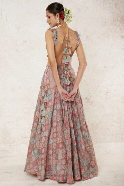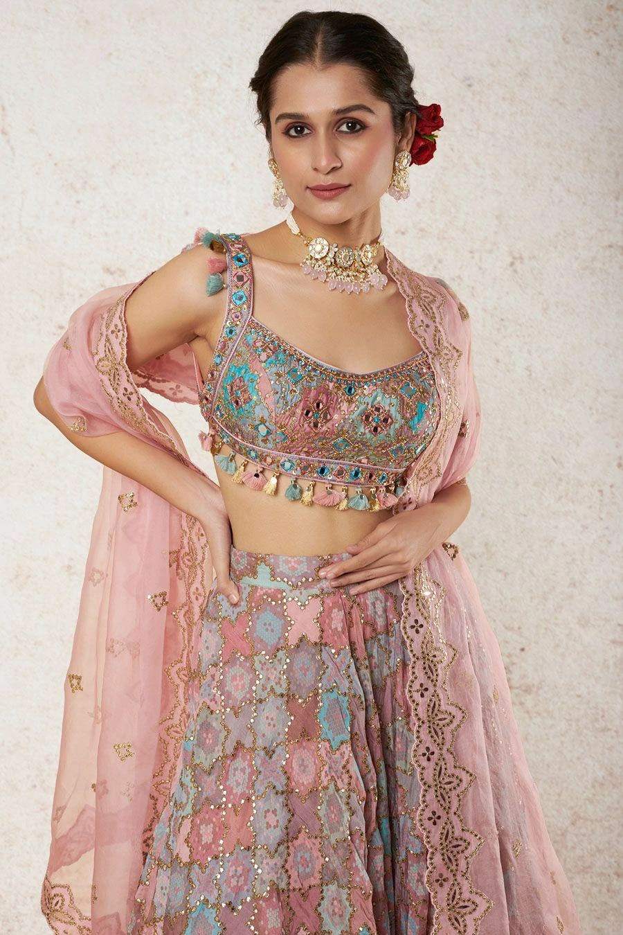 This fun and feminine blush pink lehenga set is the perfect choice for the bridesmaid. Crafted in silk, this set features a strappy choli, embellished with mirrors and tassels paired with an equally versatile lehenga and an organza dupatta.