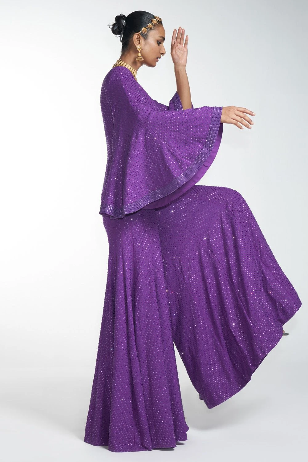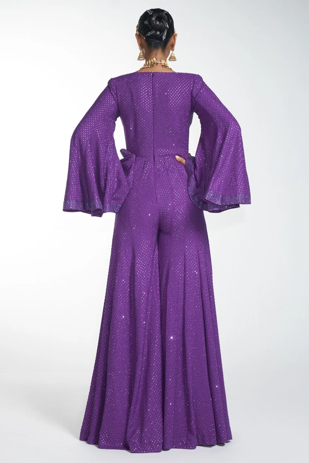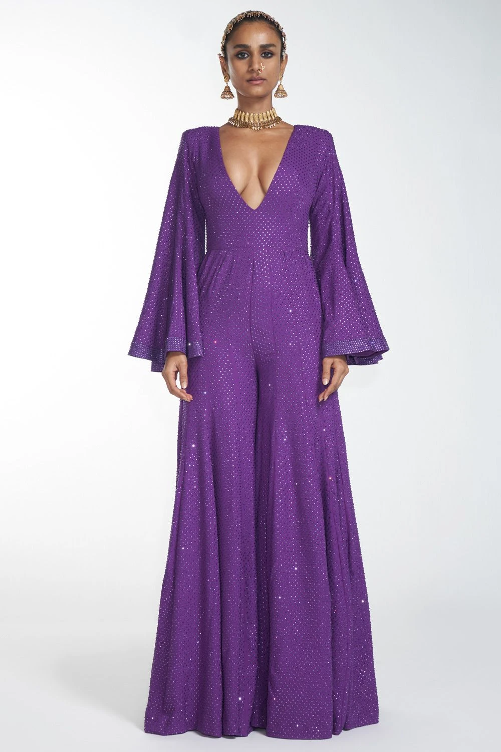 Sway like a disco ball at your cocktail evenings in this purple jumpsuit. It is fabricated in butter crepe fabric with crystal embellishments all over and features a sultry neckline & bell sleeves. You can style it with a pair of statement danglers.