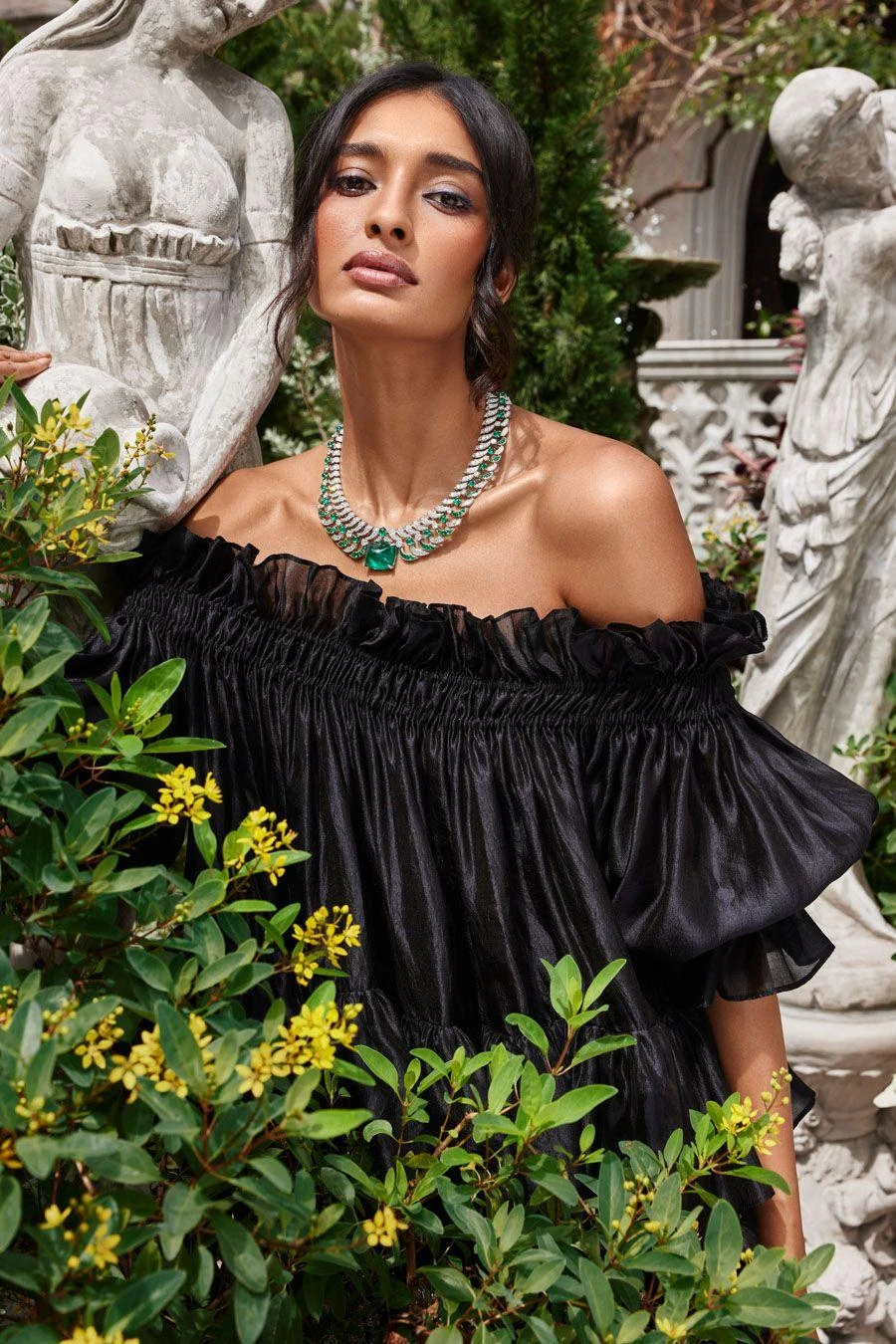 The perfect amalgamation of style and comfort, this lehenga set works across occasions. Crafted in silk, this set features a ruffle top paired with a zardosi embroidered lehenga. Add a pair of statement earrings to complete the look.