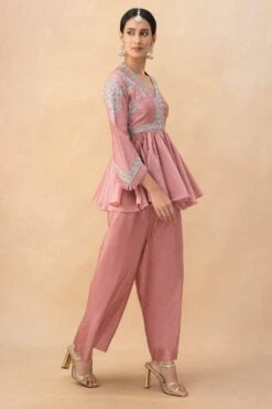 Look effortlessly stylish in this peplum top. Crafted in silk, this top features an embroidered yoke and pleated details. The embroidery gives it that wow factor and it can be styled with a lehenga, dhoti pants or a trouser.