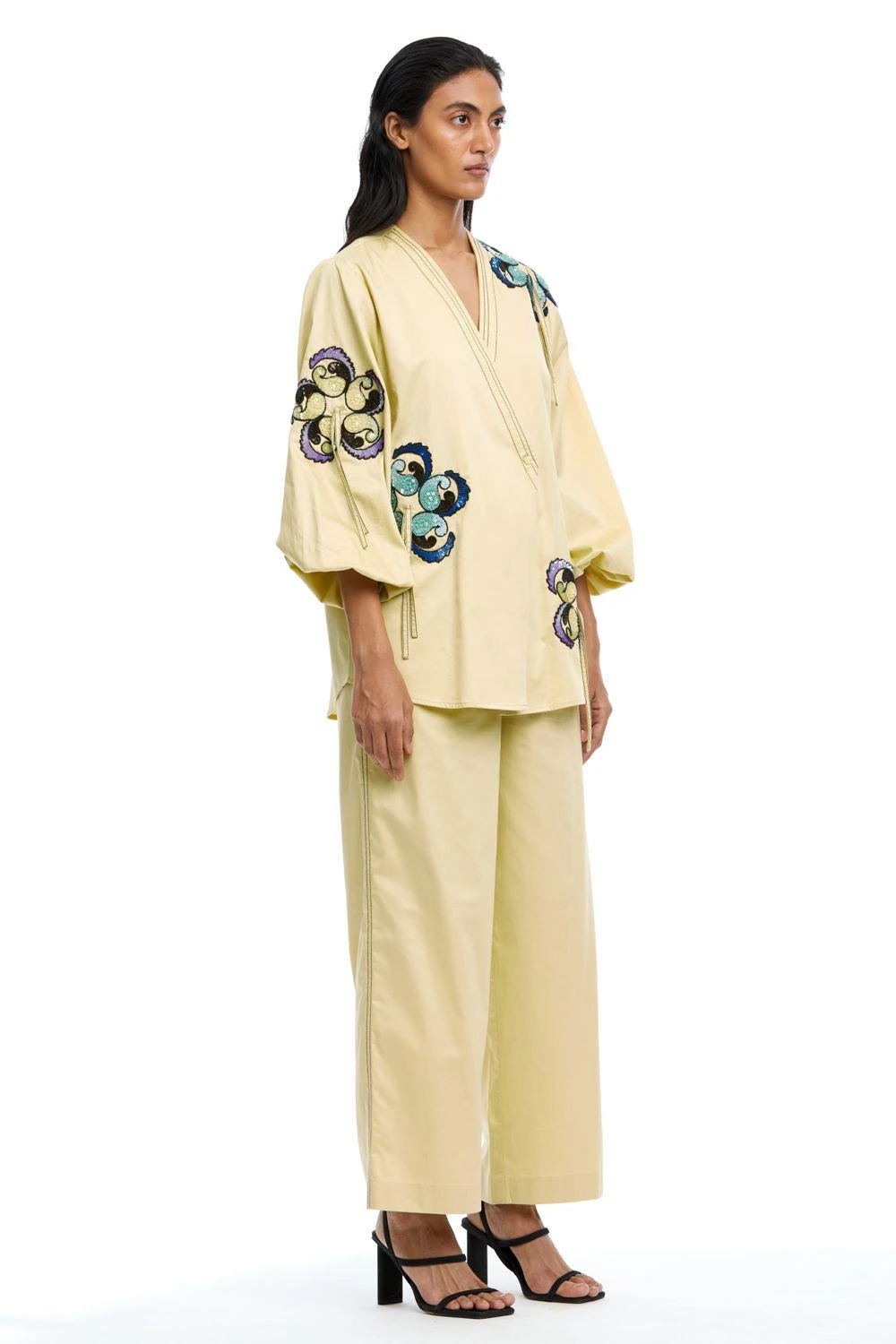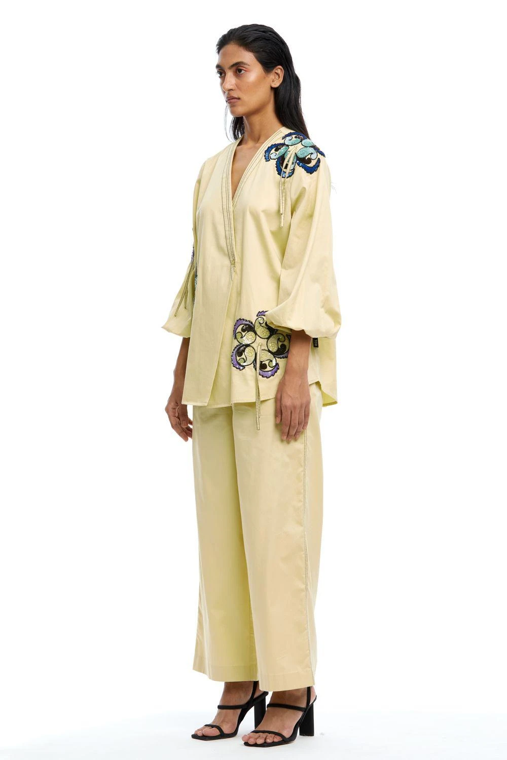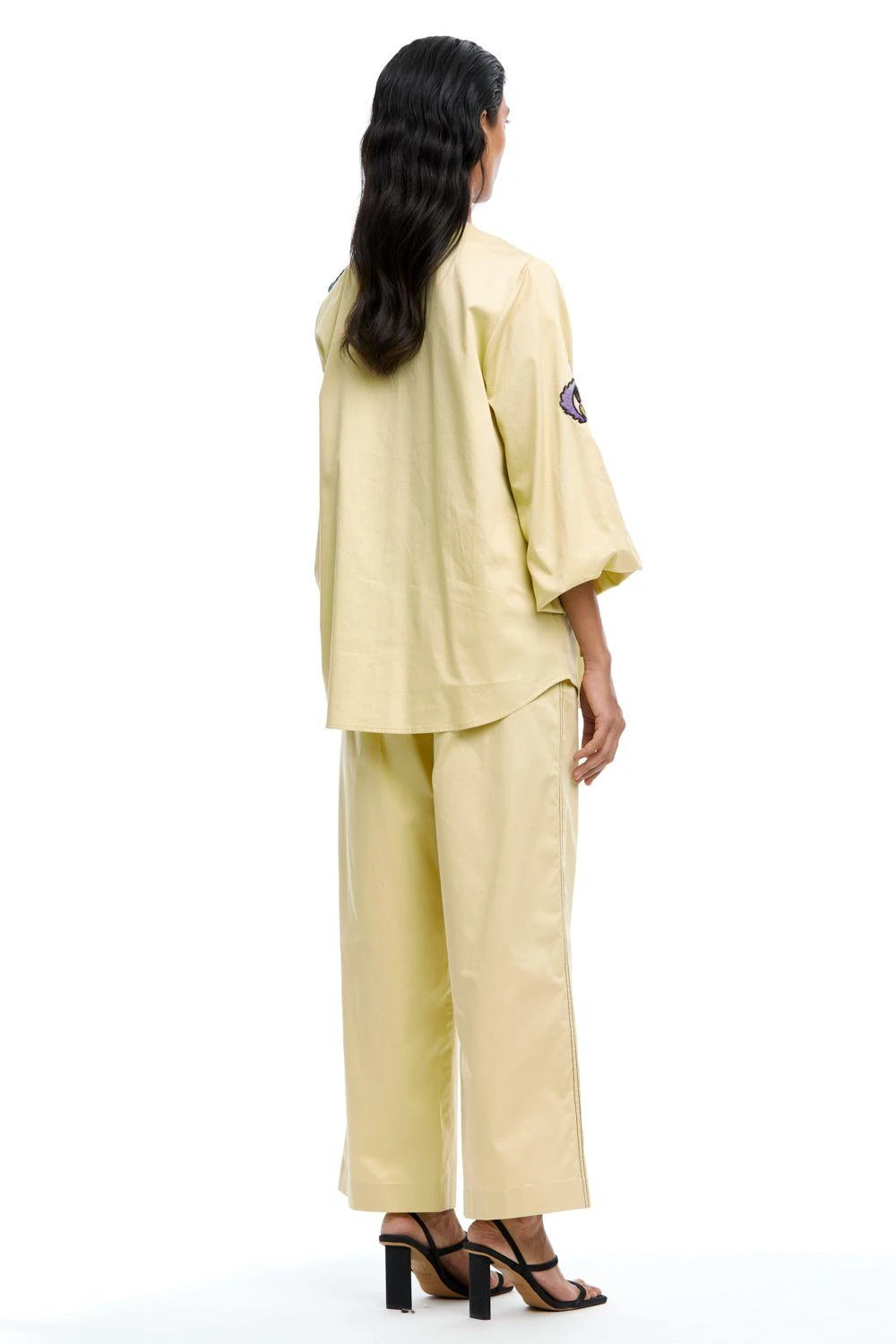 Radiate in style with this Yellow Hand-Embellished Shirt. Featuring a chic front tie and gracefully gathered sleeves, this shirt is a harmonious blend of artistry and sophistication.