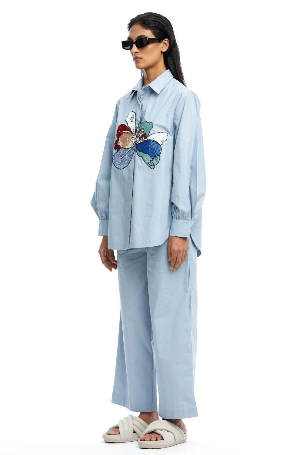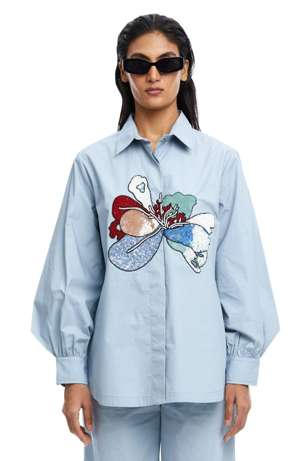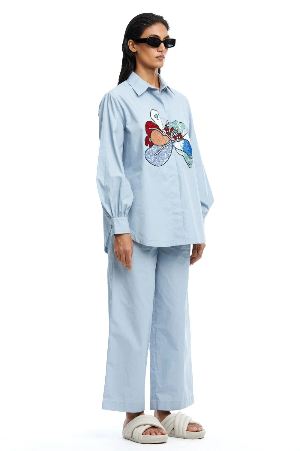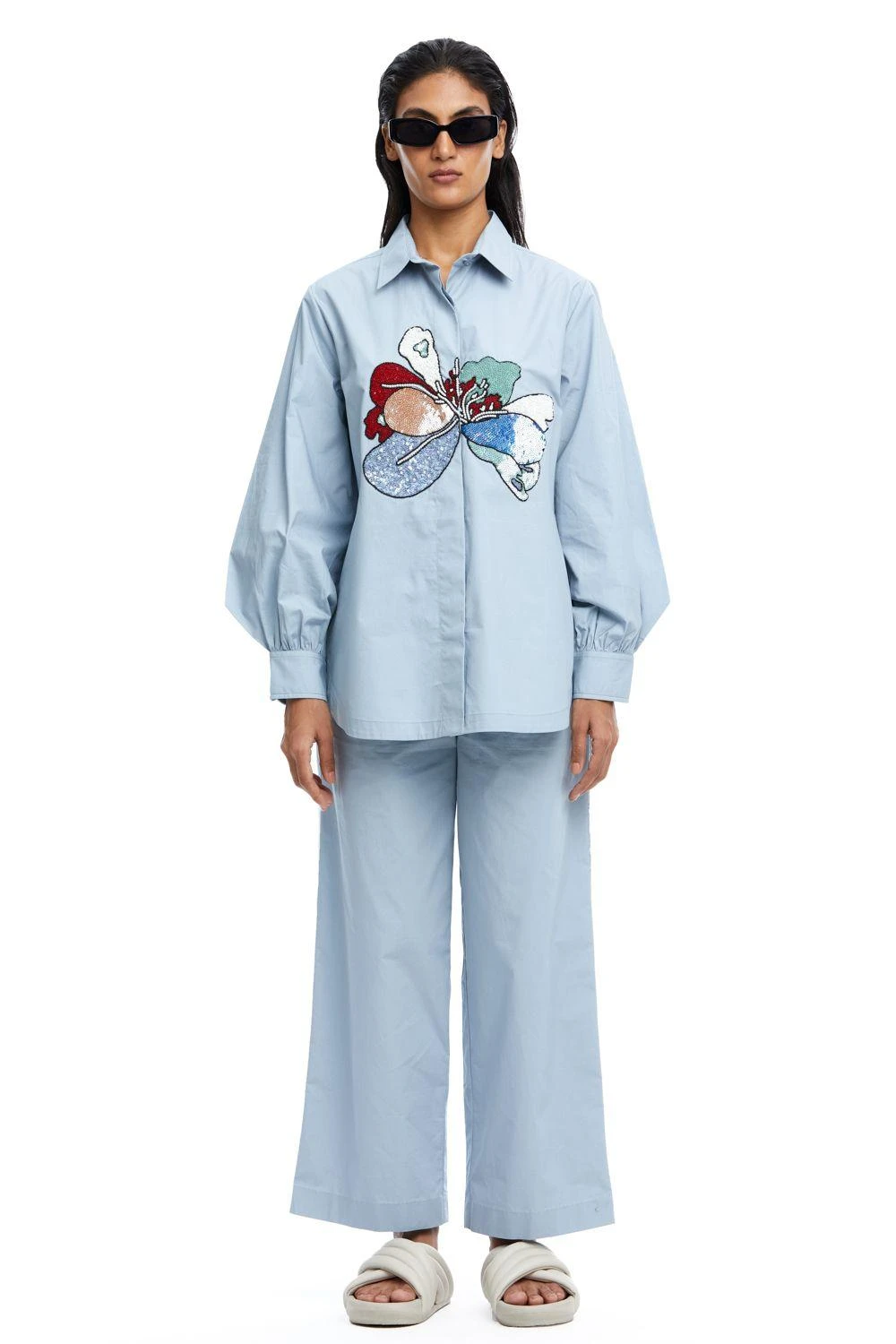 Experience opulence with this Blue Hand-Embellished Shirt. The intricate details and gathered sleeves exude sophistication, setting a new standard for elevated elegance.