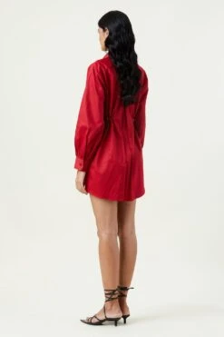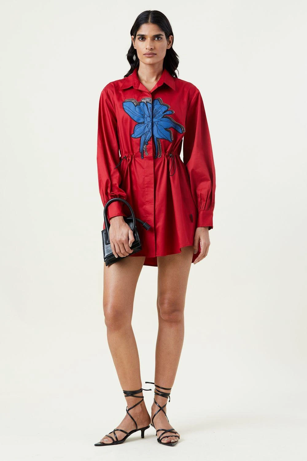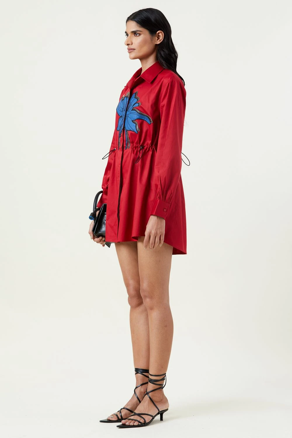 Indulge in chic elegance with this Red Embellished Shirt Dress. Impeccable ruching adds a touch of allure, creating a statement piece that effortlessly merges style and sophistication.