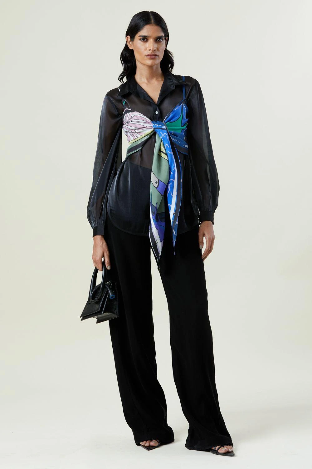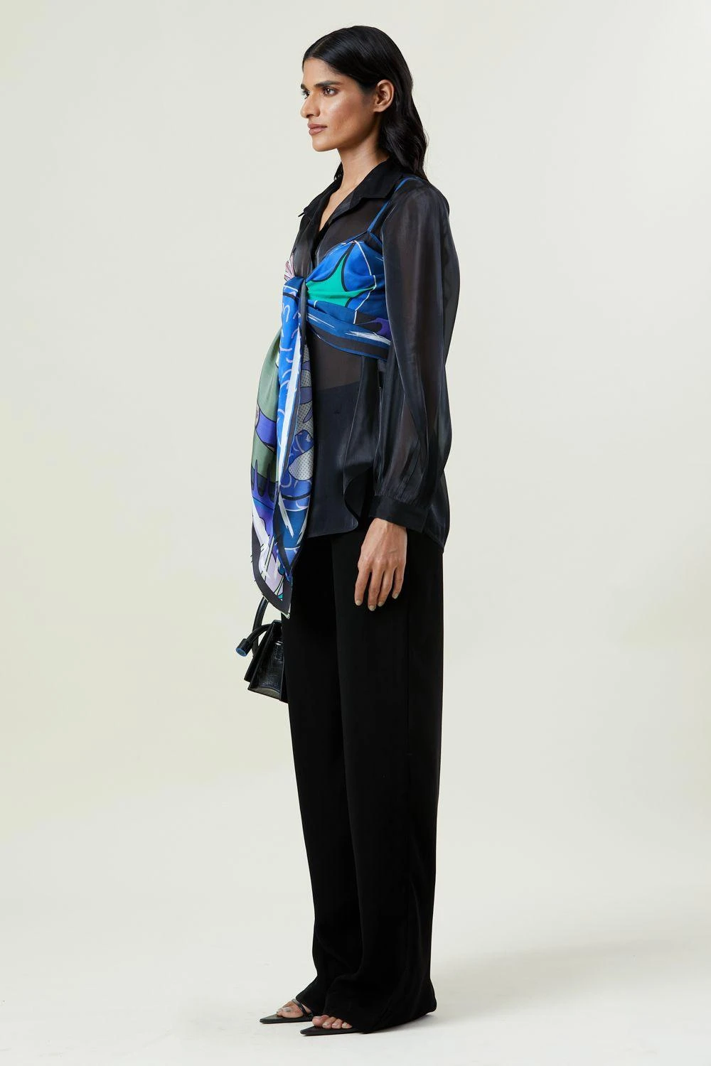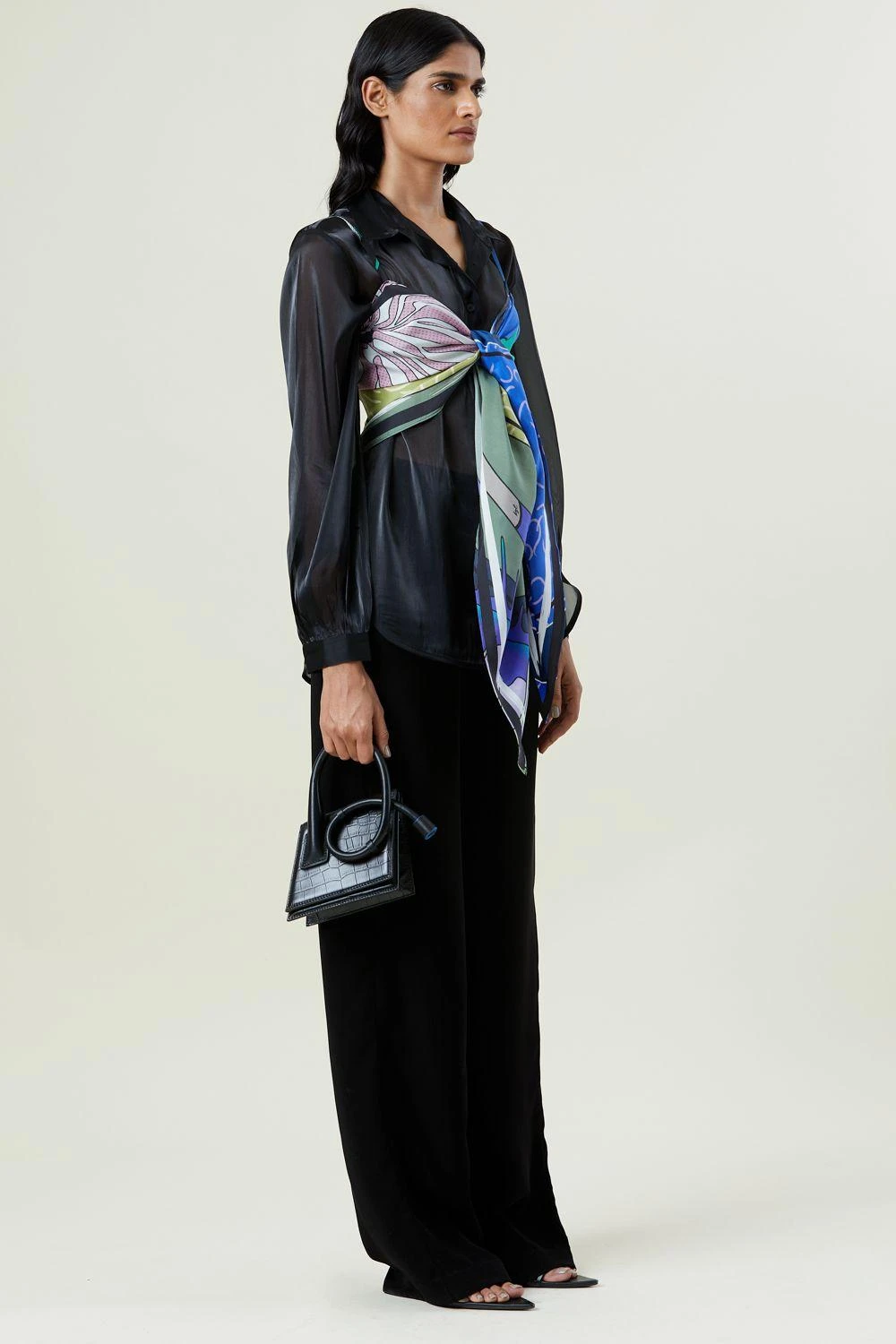 Indulge in opulence with this Multicoloured engineered print tie-up top. Each piece is a masterpiece, adorned with meticulous detailing, offering an ensemble that effortlessly captures sophistication and style.