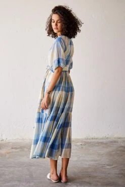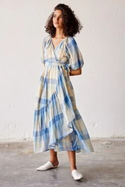 Step into classic charm with this blue checkered knot cotton wrap dress. Featuring a front tie-up opening and delicately elasticated sleeve hem, it’s a timeless piece that embodies casual elegance.