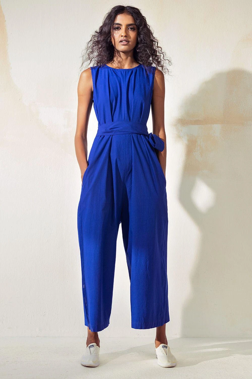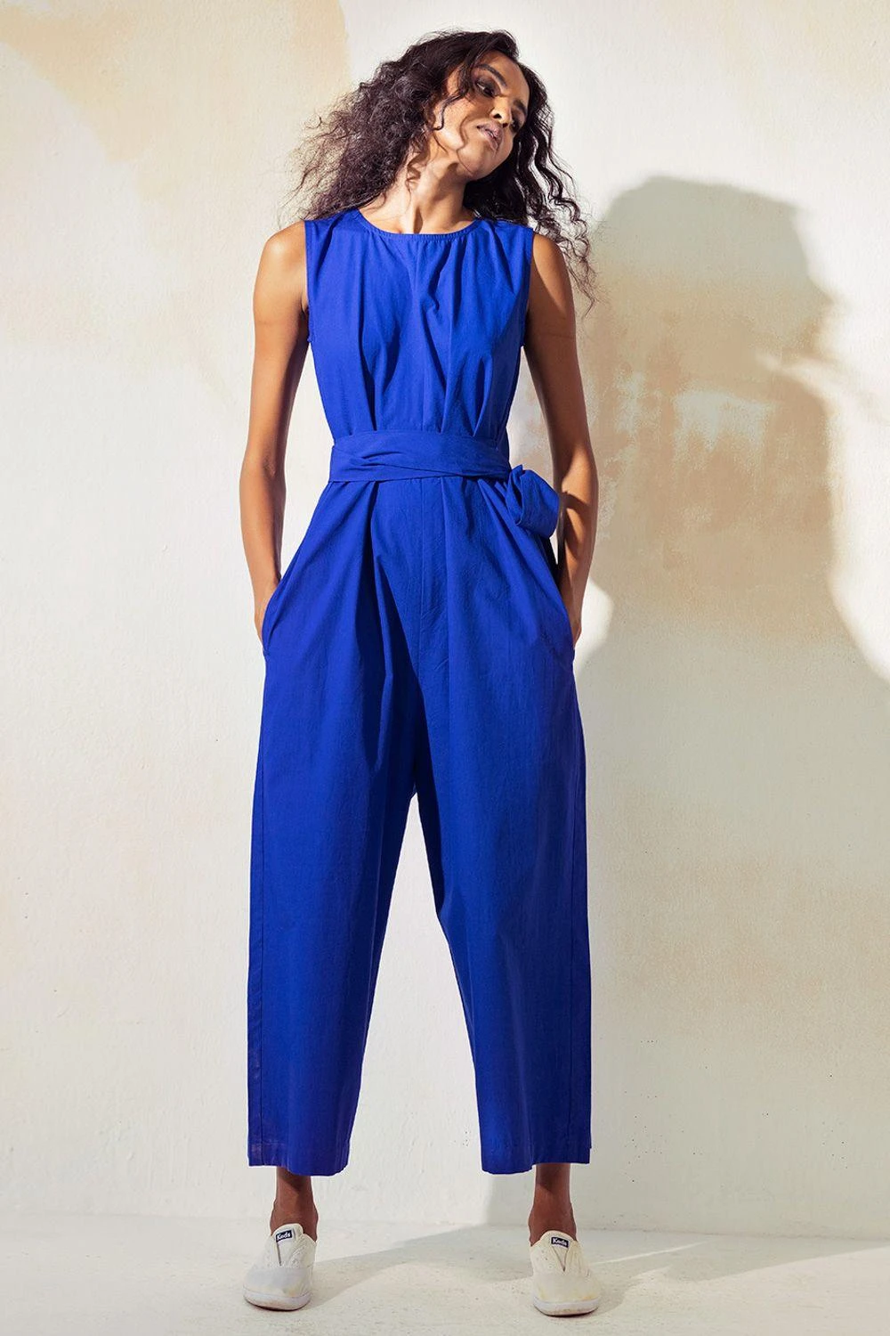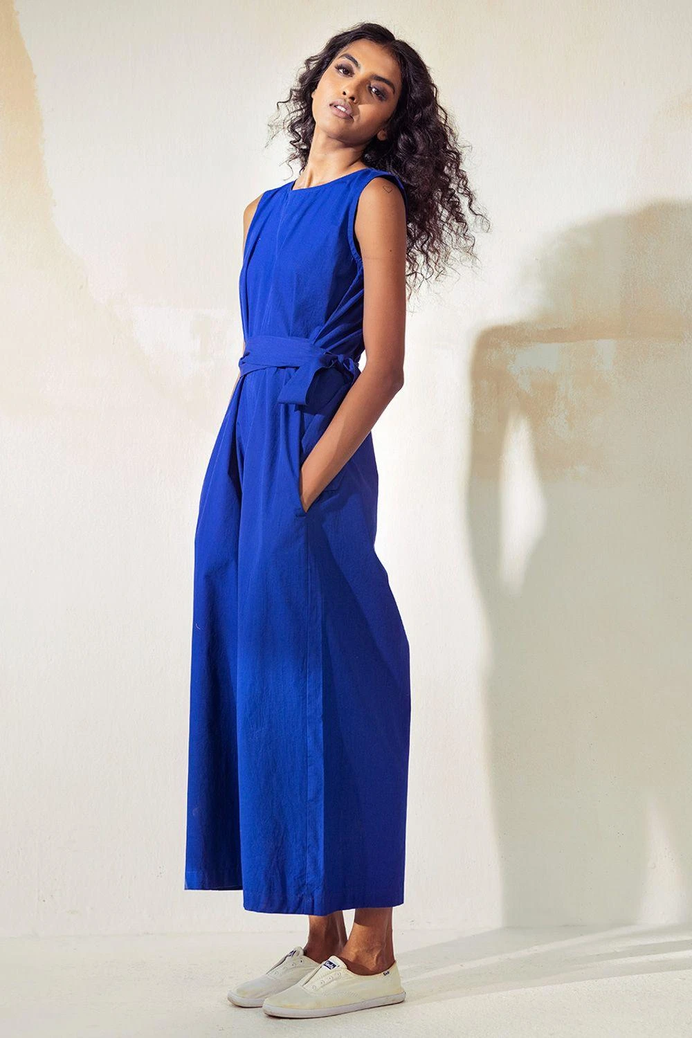 Elevate your style with this sleeveless electric blue jumpsuit. Its relaxed fit bottom and adjustable waist belt allow you to define your own unique look, making a bold fashion statement.