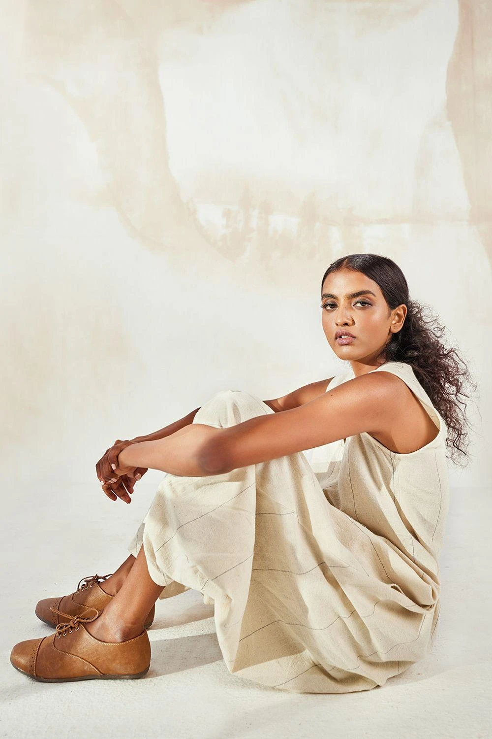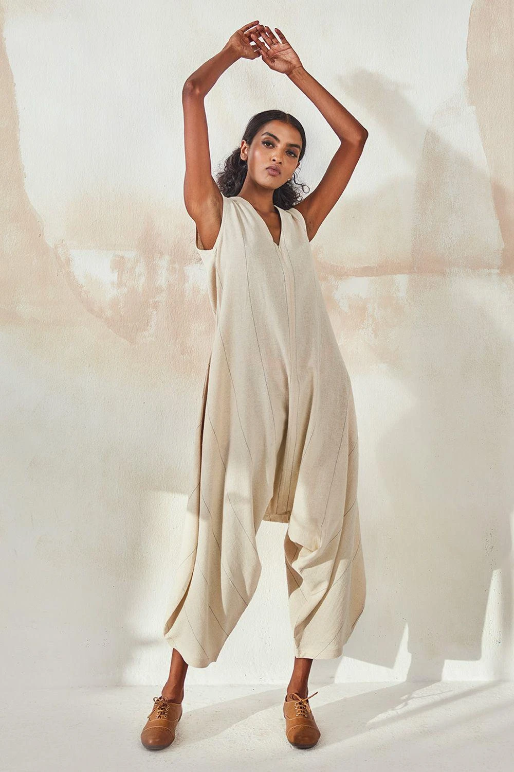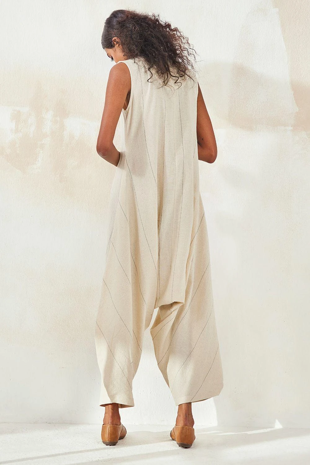 Indulge in comfort and style with this relaxed fit striped jumpsuit. It features a convenient front invisible zip opening, a trendy drop crotch design, and handy side pockets for an effortlessly chic look.