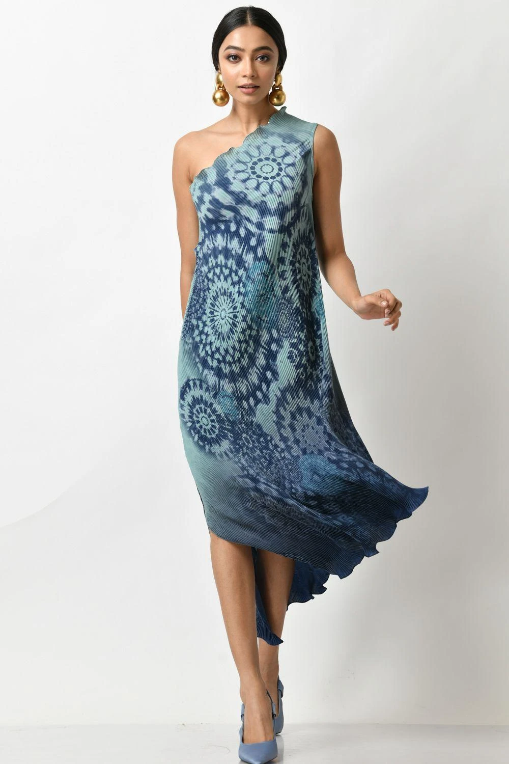 This chic ombre batik printed pleated one shoulder dress is perfect for dressy events. Style this versatile piece with a choker or statement earrings for an effortlessly stylish look.