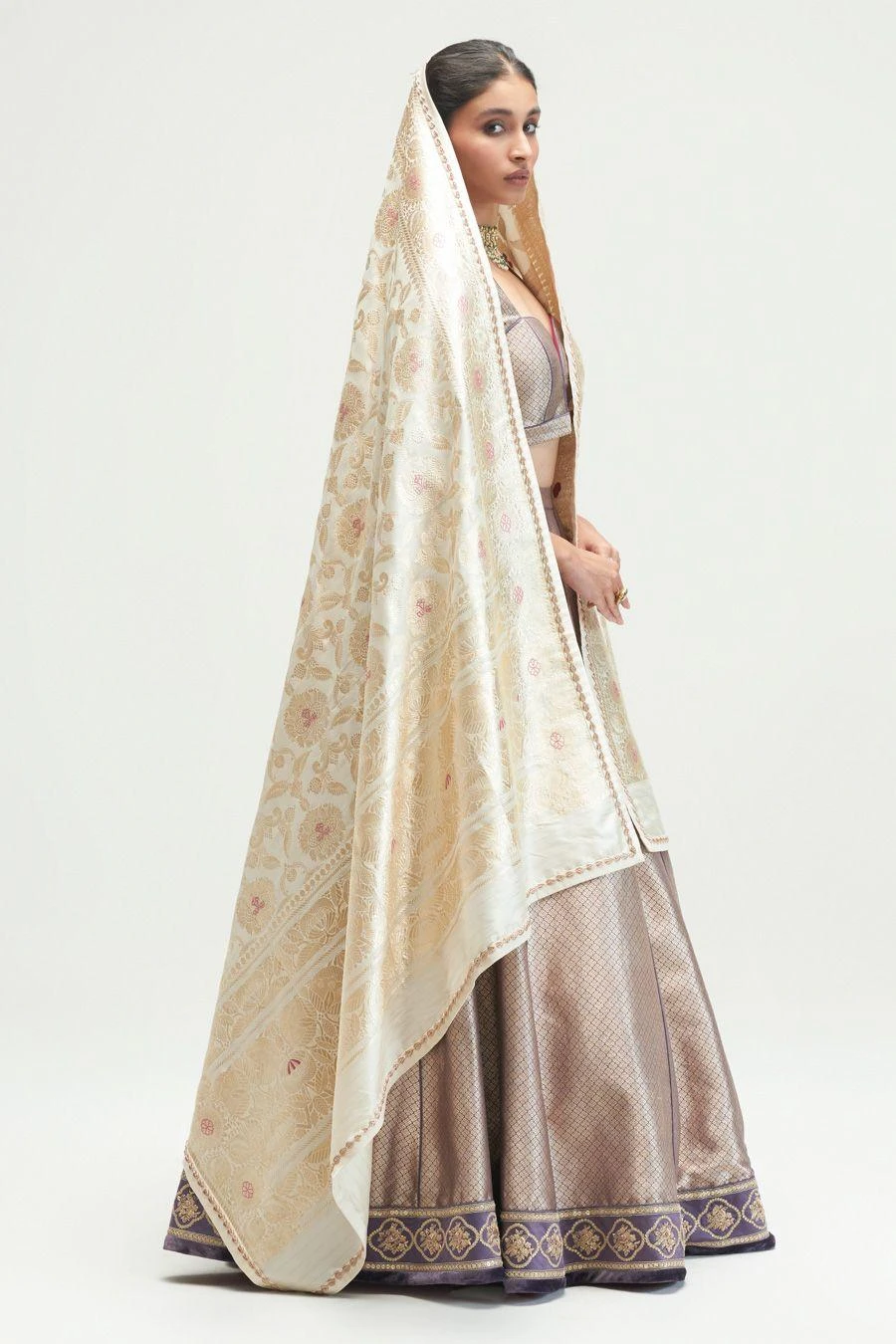 Add this ethereal ensemble to your wedding trousseau for an elegant look. It is crafted in silk brocade which brings opulence to this outfit & the painstaking embroidery and print graces it like nothing else.