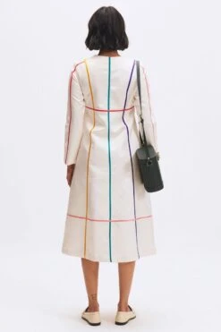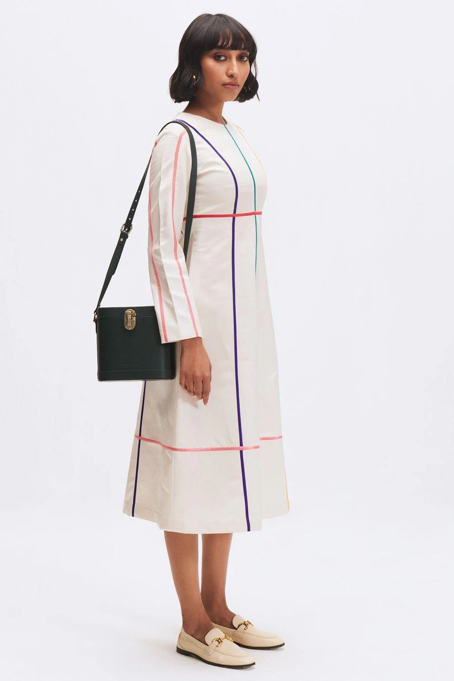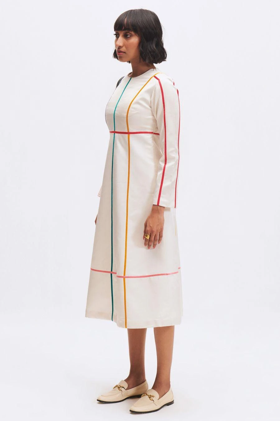 From your work desk to the brunch table & from lounging at home to catching flights, you can always count on this dress. Crafted in silk satin crepe this round neck dress features striped details.