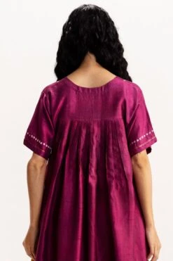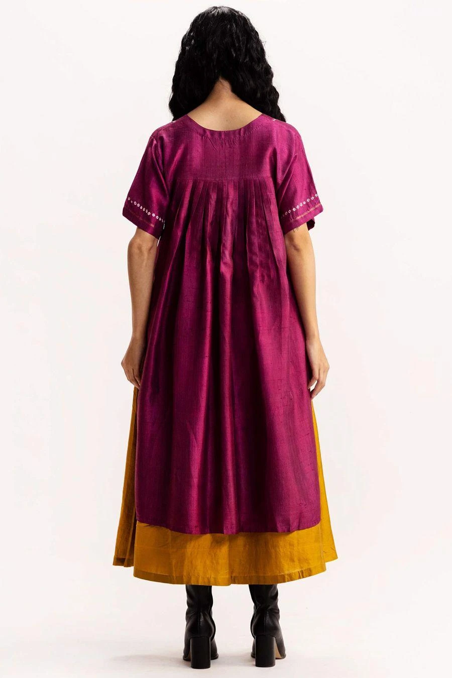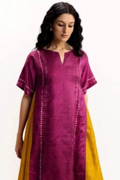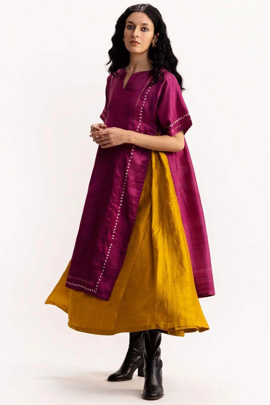 Medium’s new runway collection expands on its work with Jamdani and Bandhani. Crafted in handwoven Bengal silk & this bandhani kurta is paired with a mustard slip dress. Style this set with oxidised jewellery to complete the look.