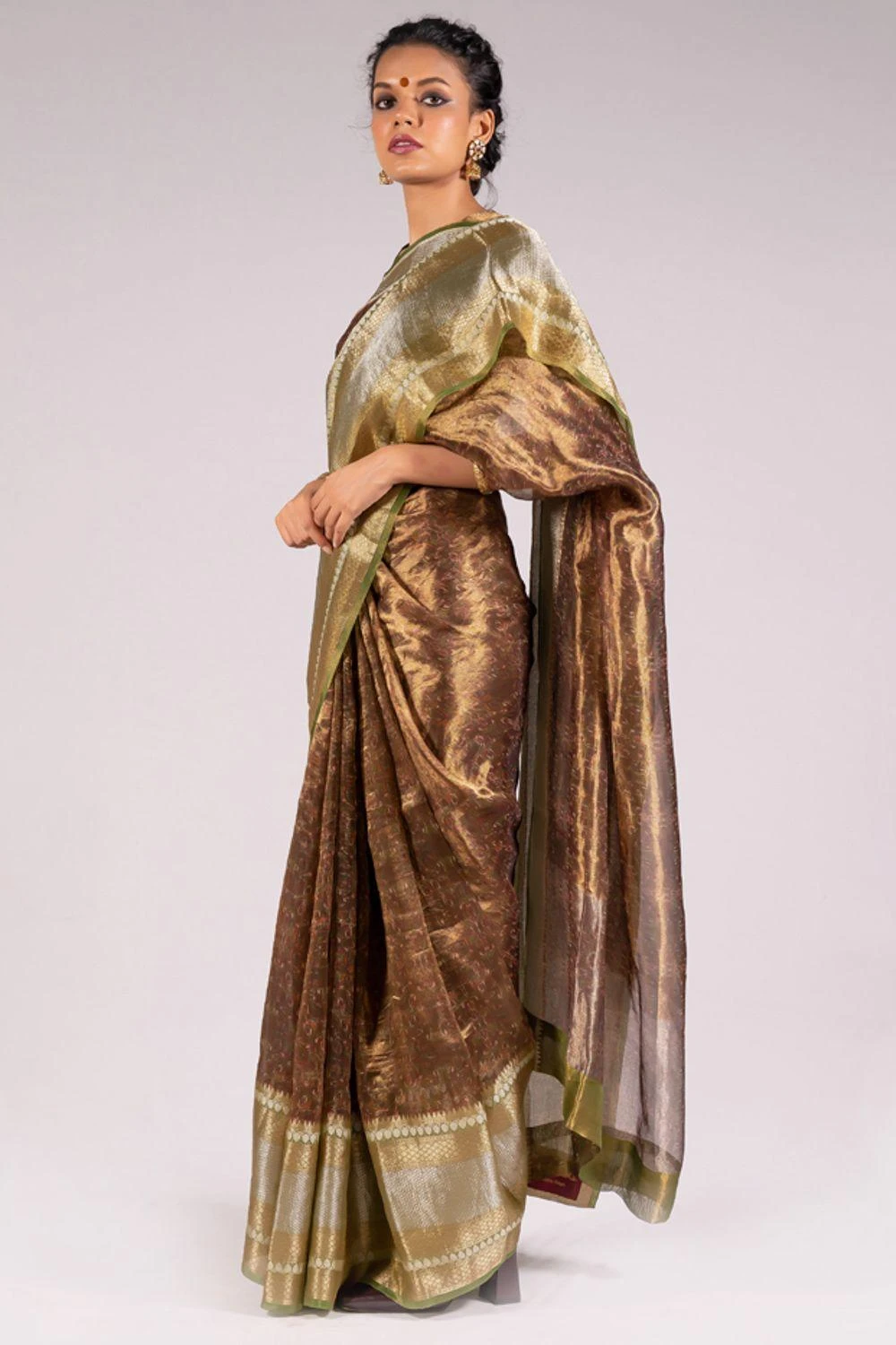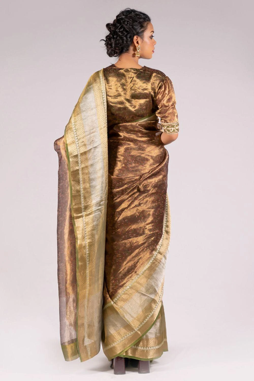 This green silk tissue printed blouse is made from a silk tissue zari printed fabric with zardosi metal embroidery & munga patchwork on the sleeves. This classic handwoven piece can be styled with a gold or ivory sari for an ornate festive look.