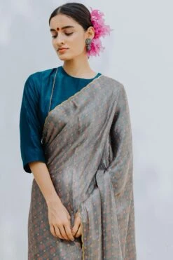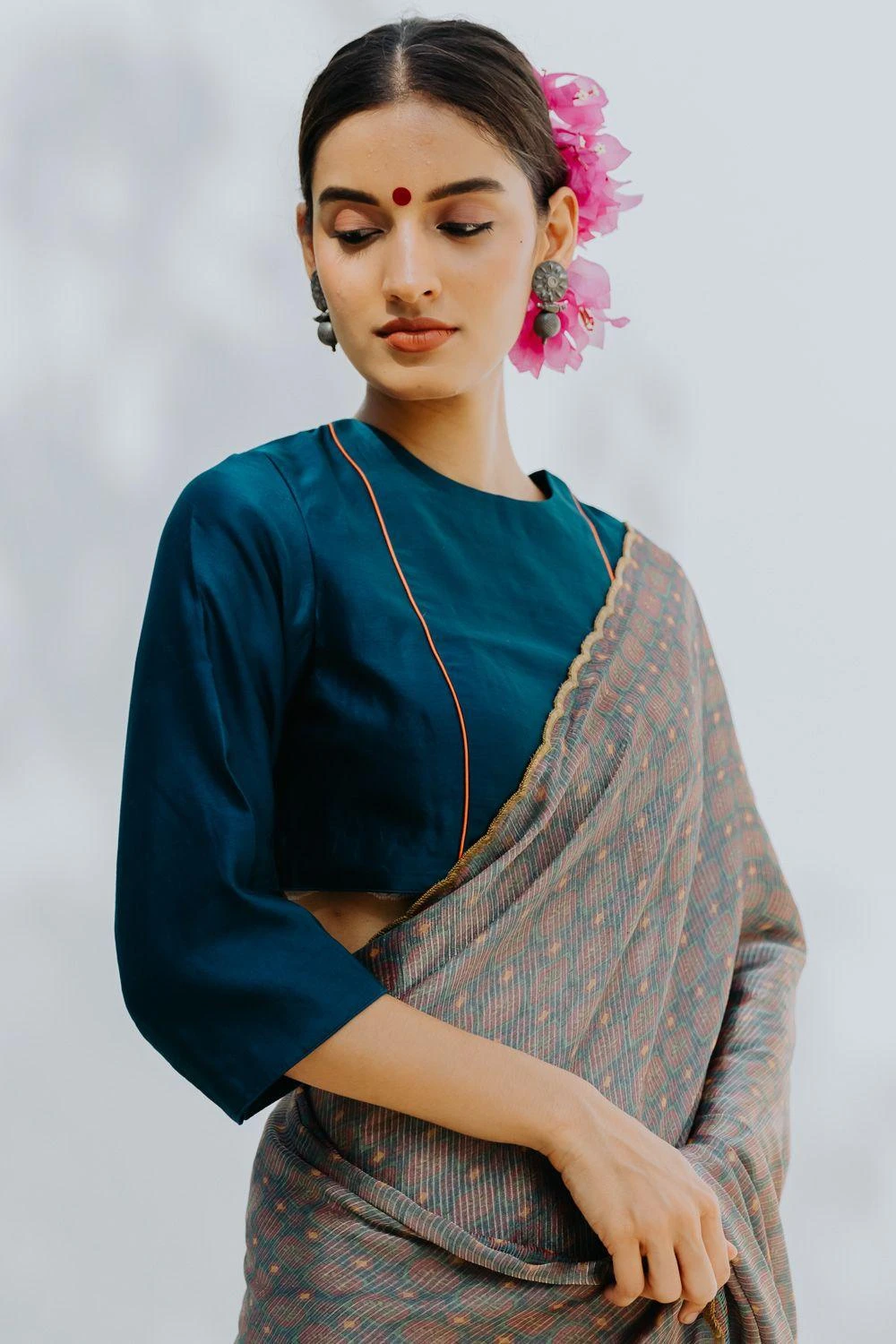 This elegant teal blue blouse is woven in handloom silk chanderi. It features a round neckline with quarter sleeves. This solid silk blouse will perfectly complement the printed saris from Mimamsaa.