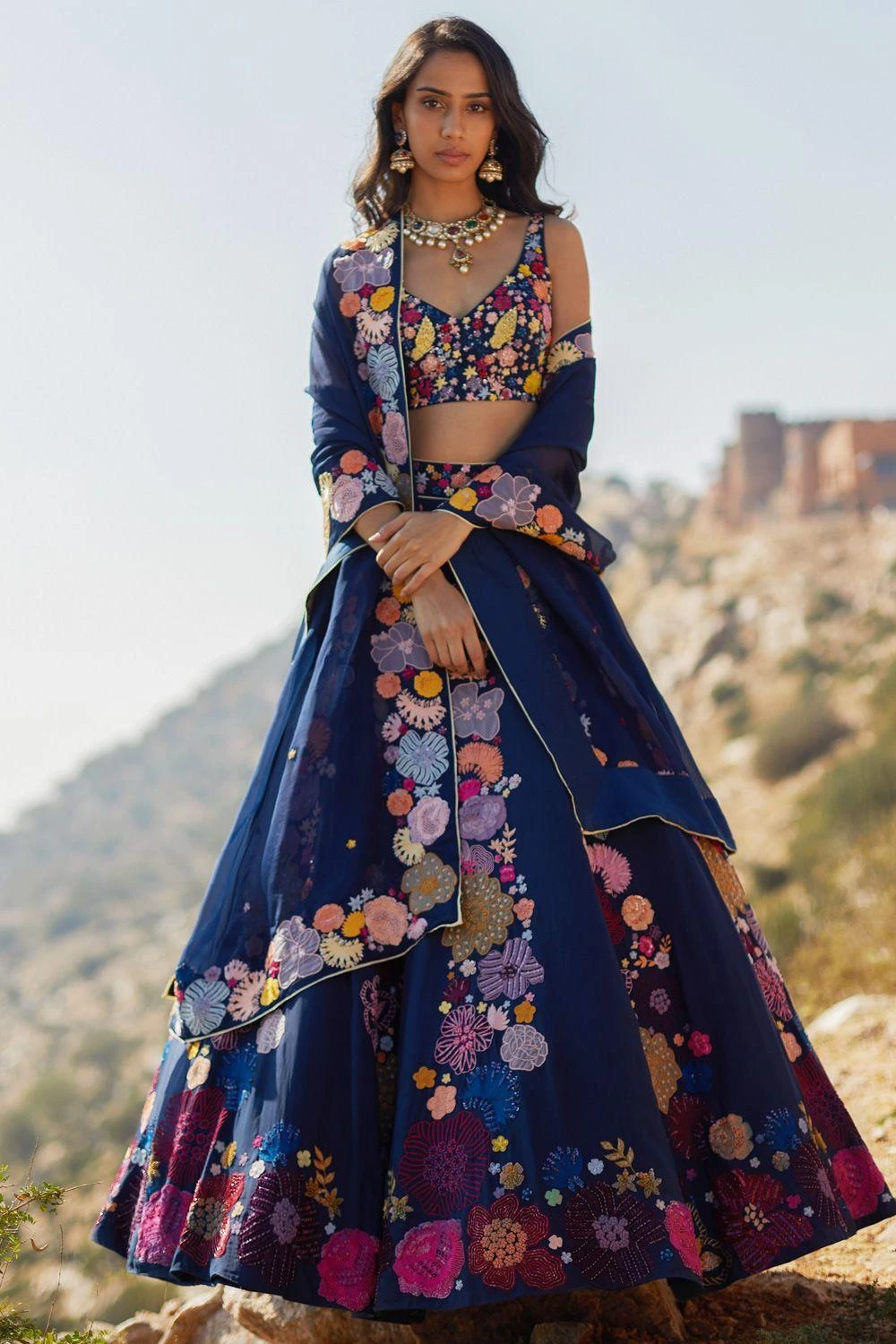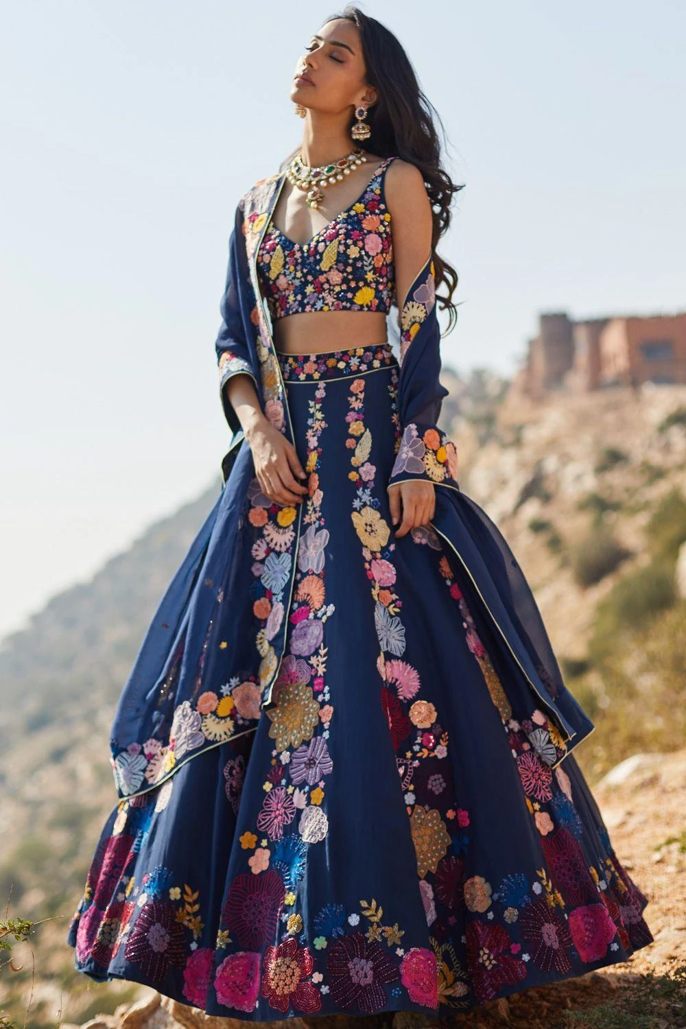 This stunning navy blue organza lehenga set is adorned with floral silk threadwork, mirror work, french knot & zardosi embroidery. Style this statement set with pearl or diamond jewellery for sangeets or receptions for a one of a kind look.