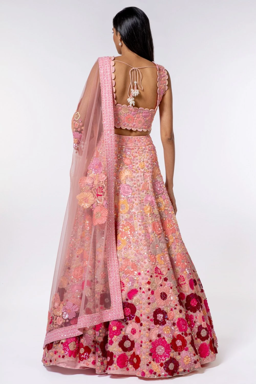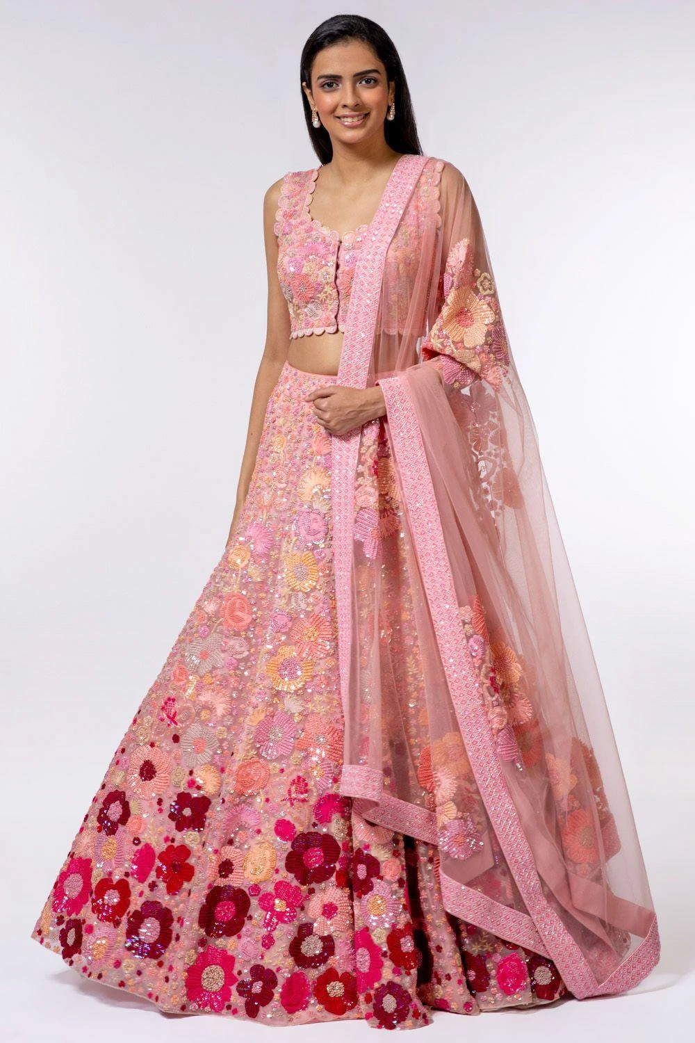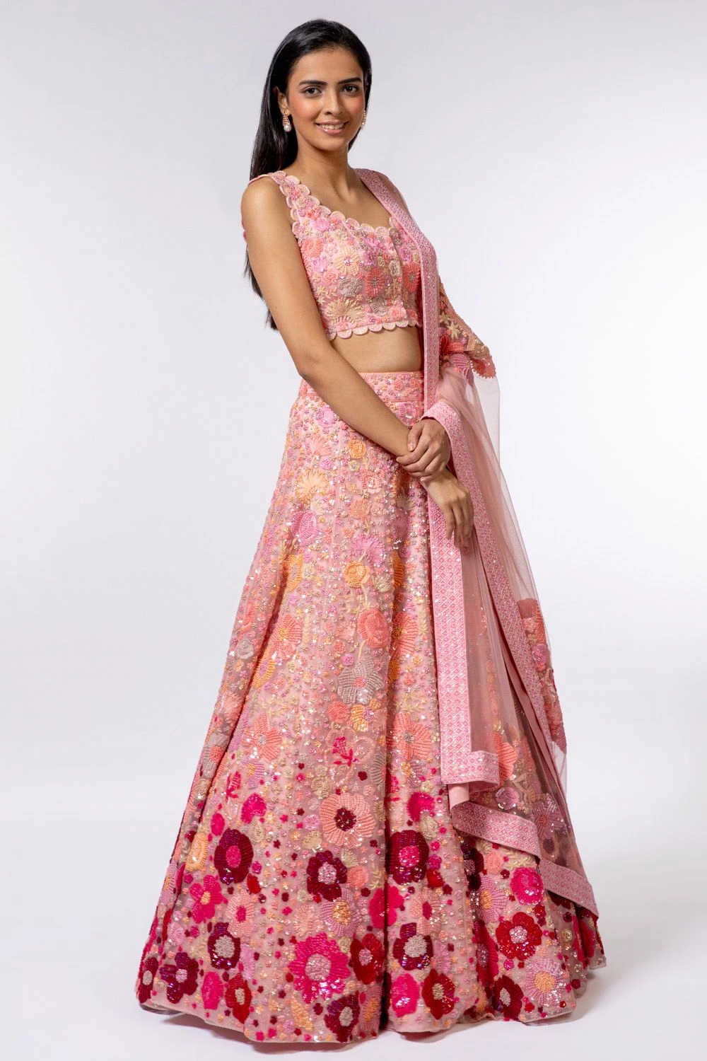 This pink embroidered lehenga set comes straight out of a dream. It is set in organza and adorned with silk thread, french knots, mirrors and zardozi embroidery. Add an elegant necklace with this look for your reception or sangeet.