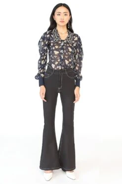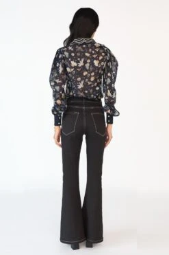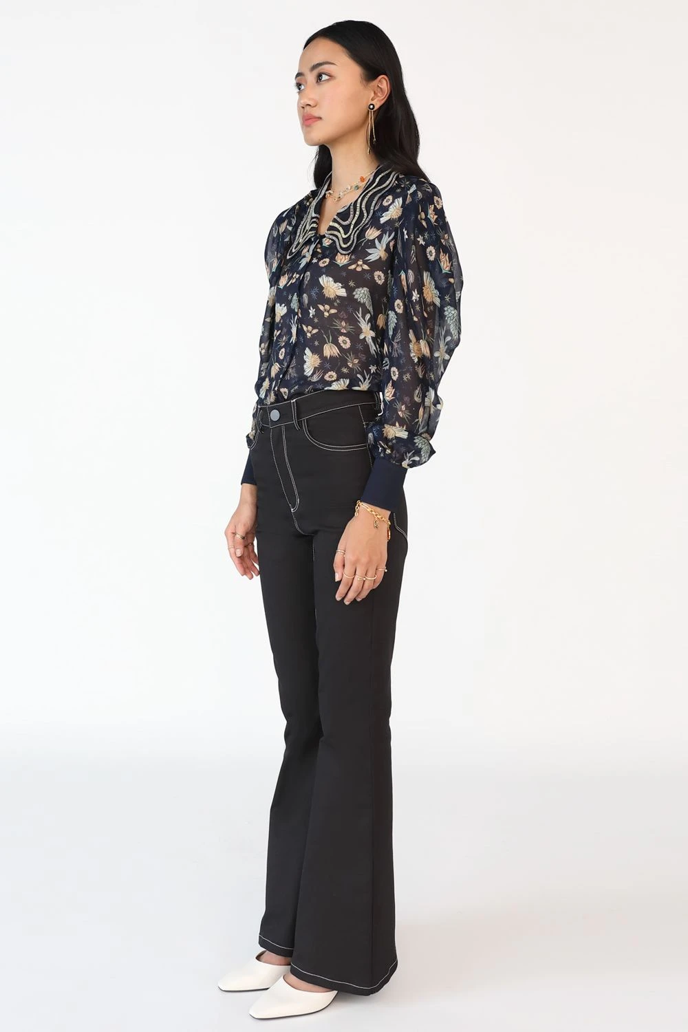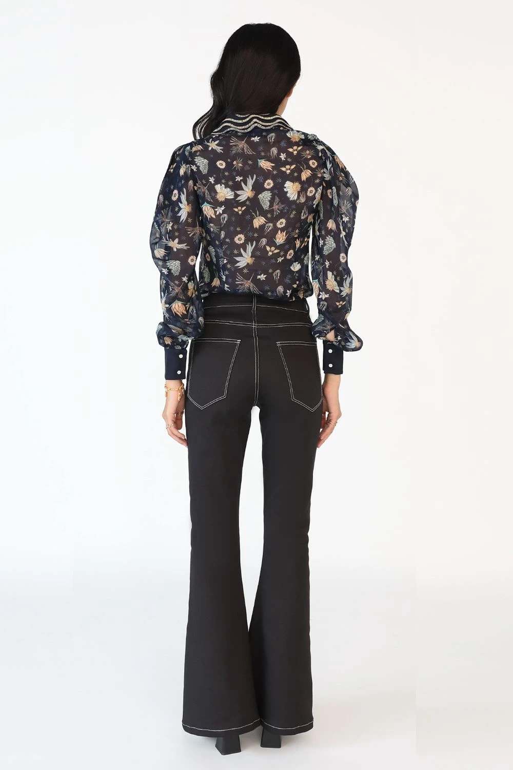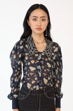 This forestial printed shirt features a handcrafted collar with wave embroidery, bishop sleeves and organza cuffs. Style this shirt with some dainty jewellery and a pair of flared jeans to complete the look.
