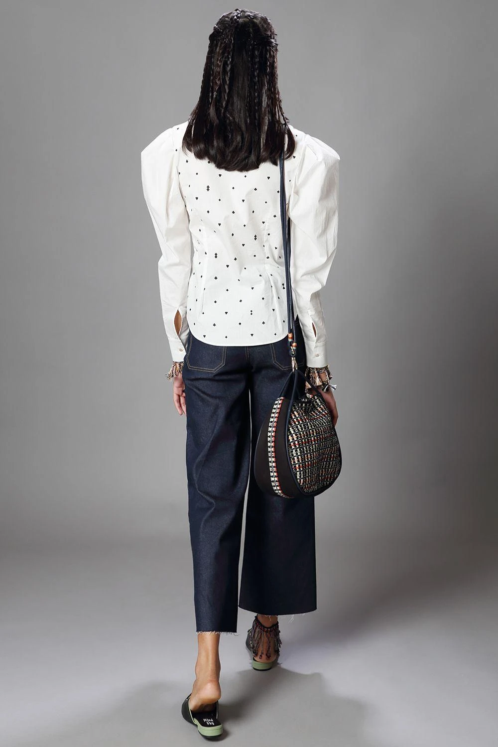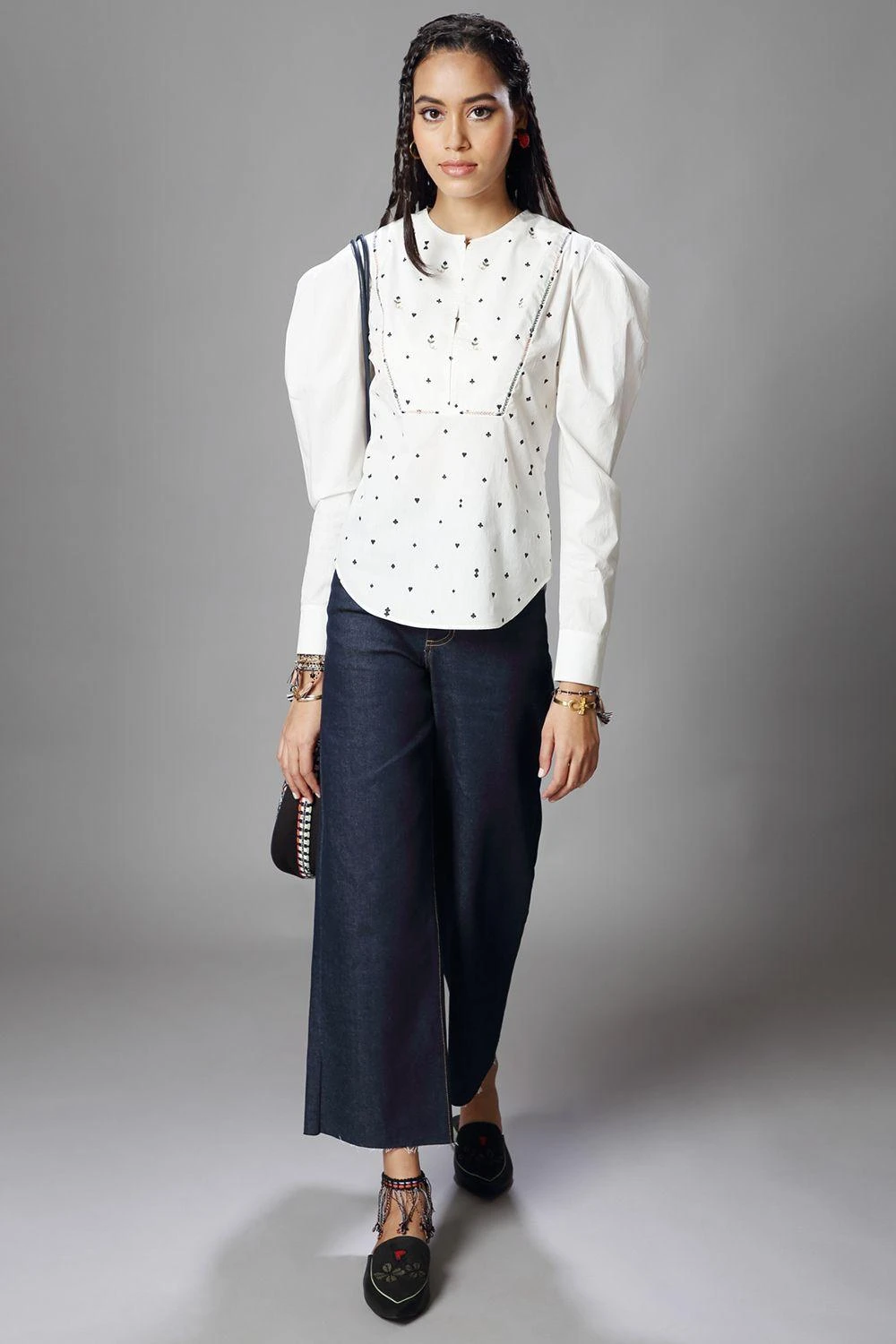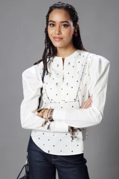 Whizz from the boardroom to the bar in this white top. Cut in organic cotton, it features voluminous sleeves and an embellished yoke. Style this top with a pair of black trousers & gold hoops to complete the look.