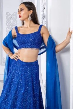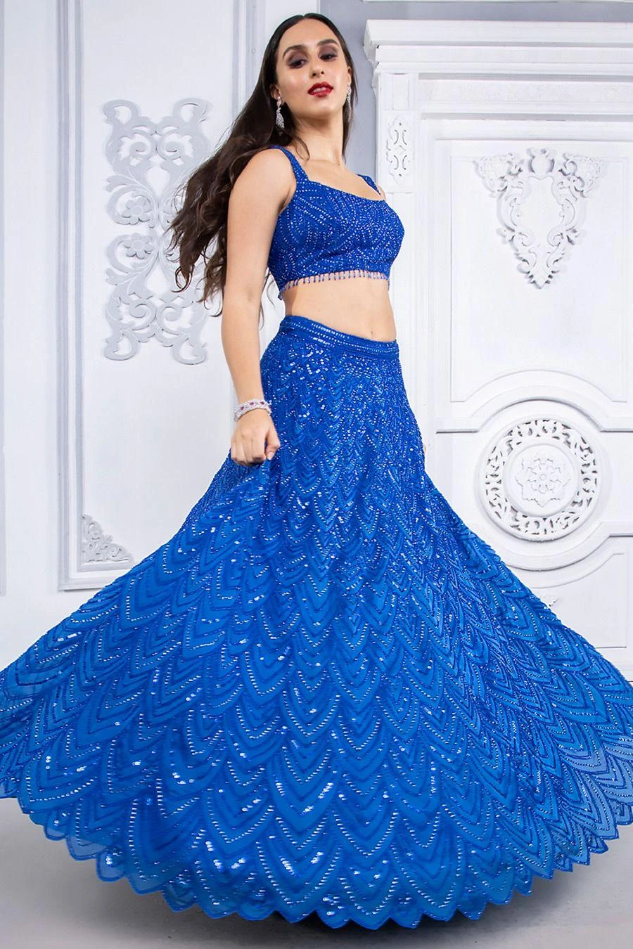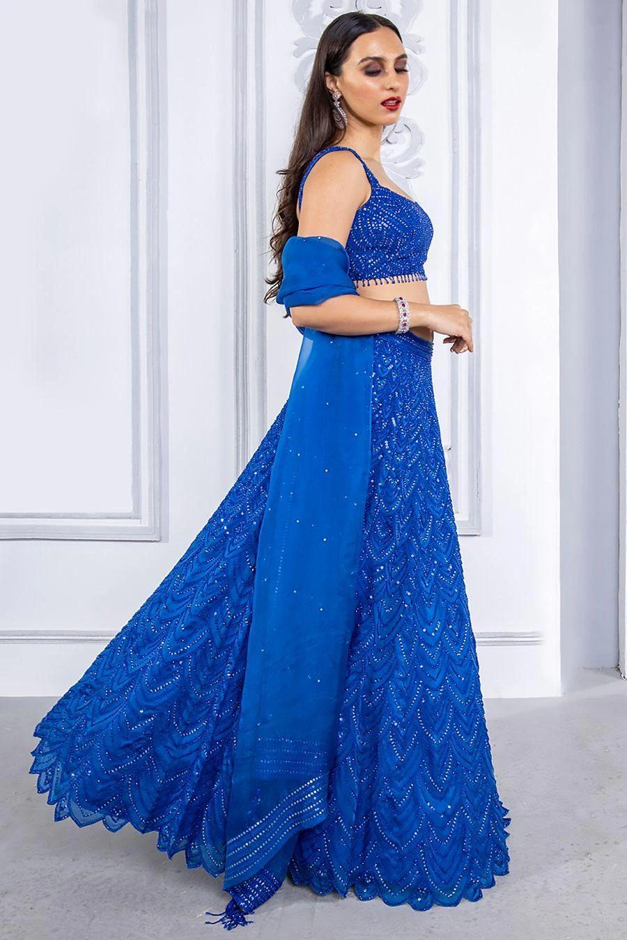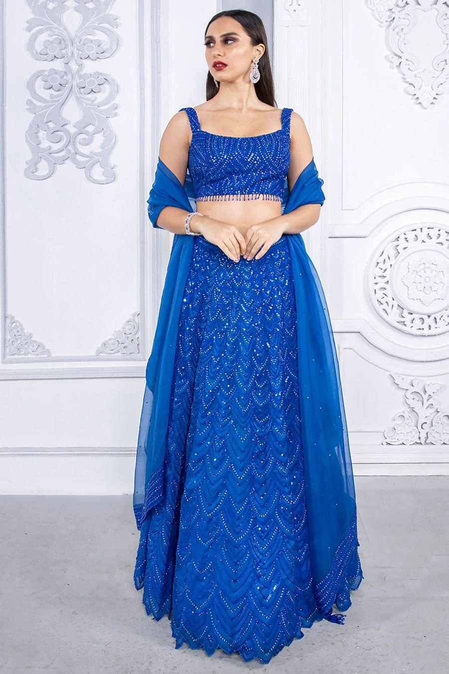 Look effortlessly stylish with this lehenga set. Crafted in organza, this set features a crystal embellished blouse paired with a coordinating dupatta & lehenga. Add a pair of statement earrings to complete the look.