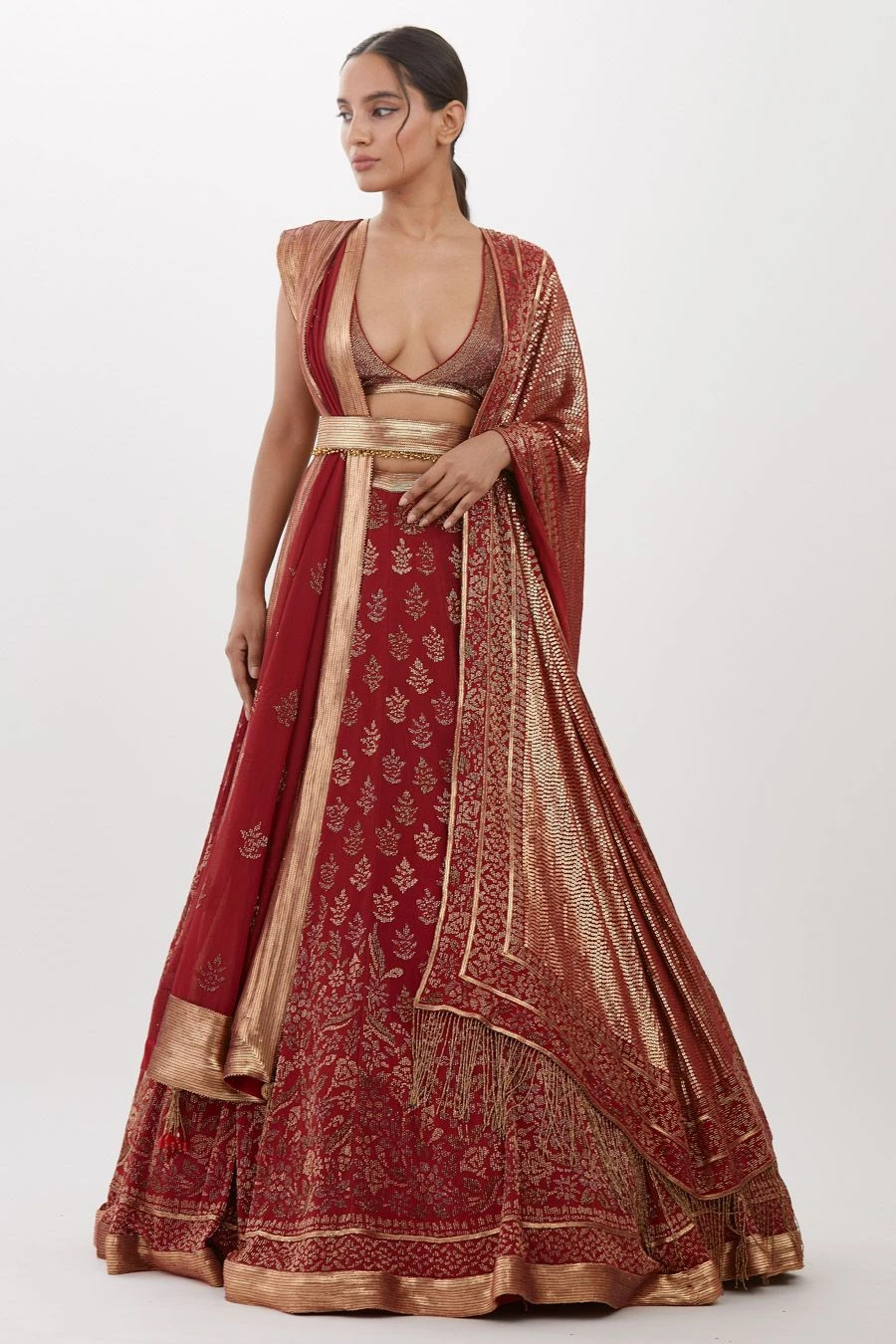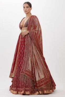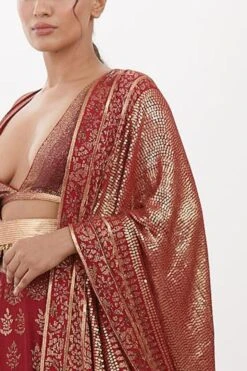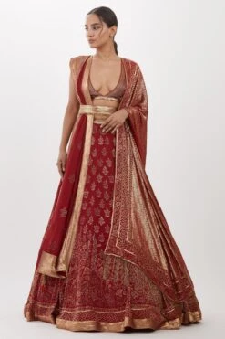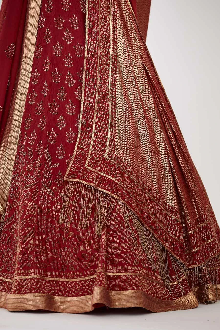 Look effortlessly stylish with this red lehenga set. Crafted in chiffon, this set features a cutdana embellished lehenga paired with an equally versatile blouse and two dupattas. Add a pair of statement earrings to complete the look