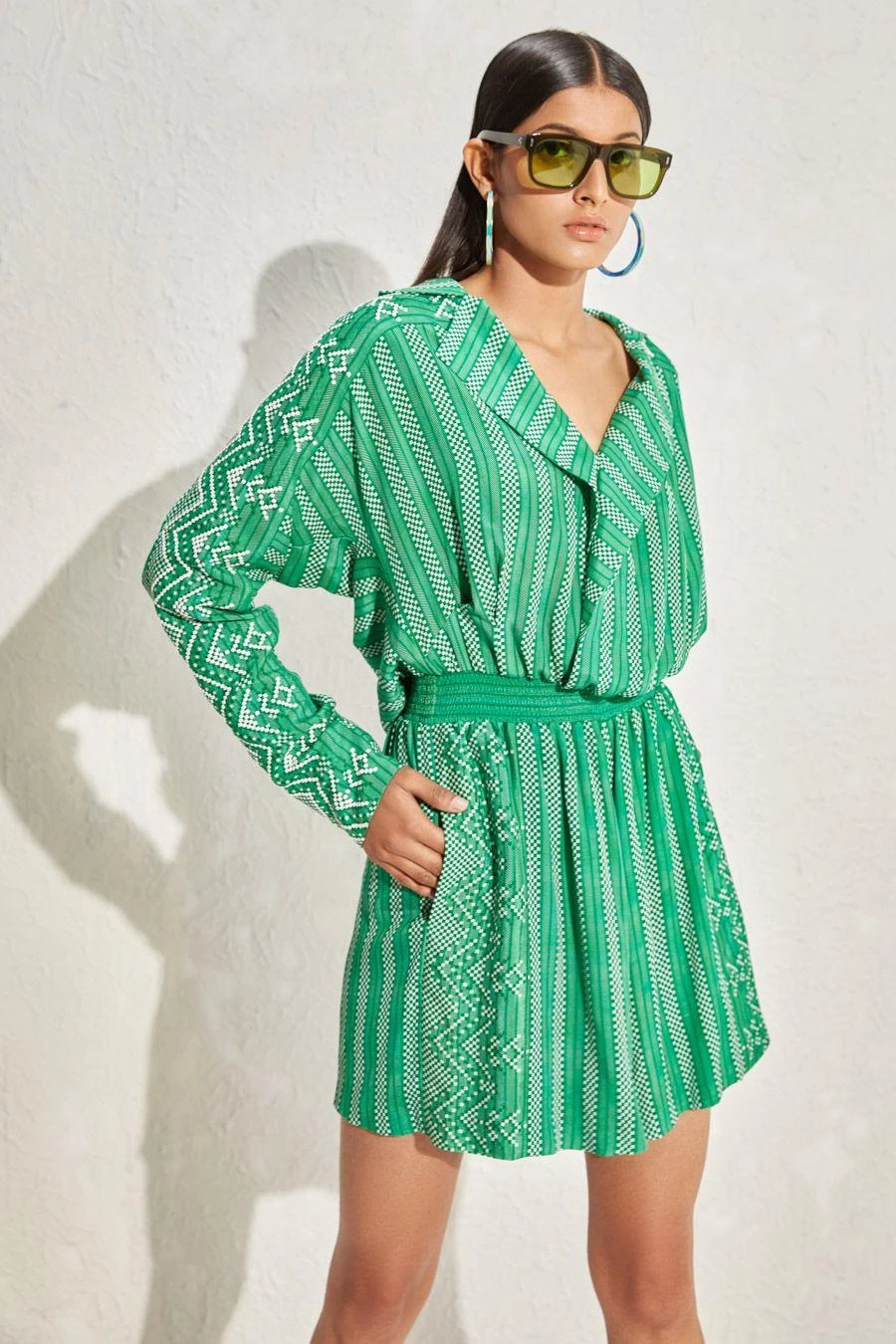 The perfect amalgamation of style and comfort, this playsuit is perfect for a day out. Crafted in georgette, this playsuit features a wide collar with geometric hand embellished details,