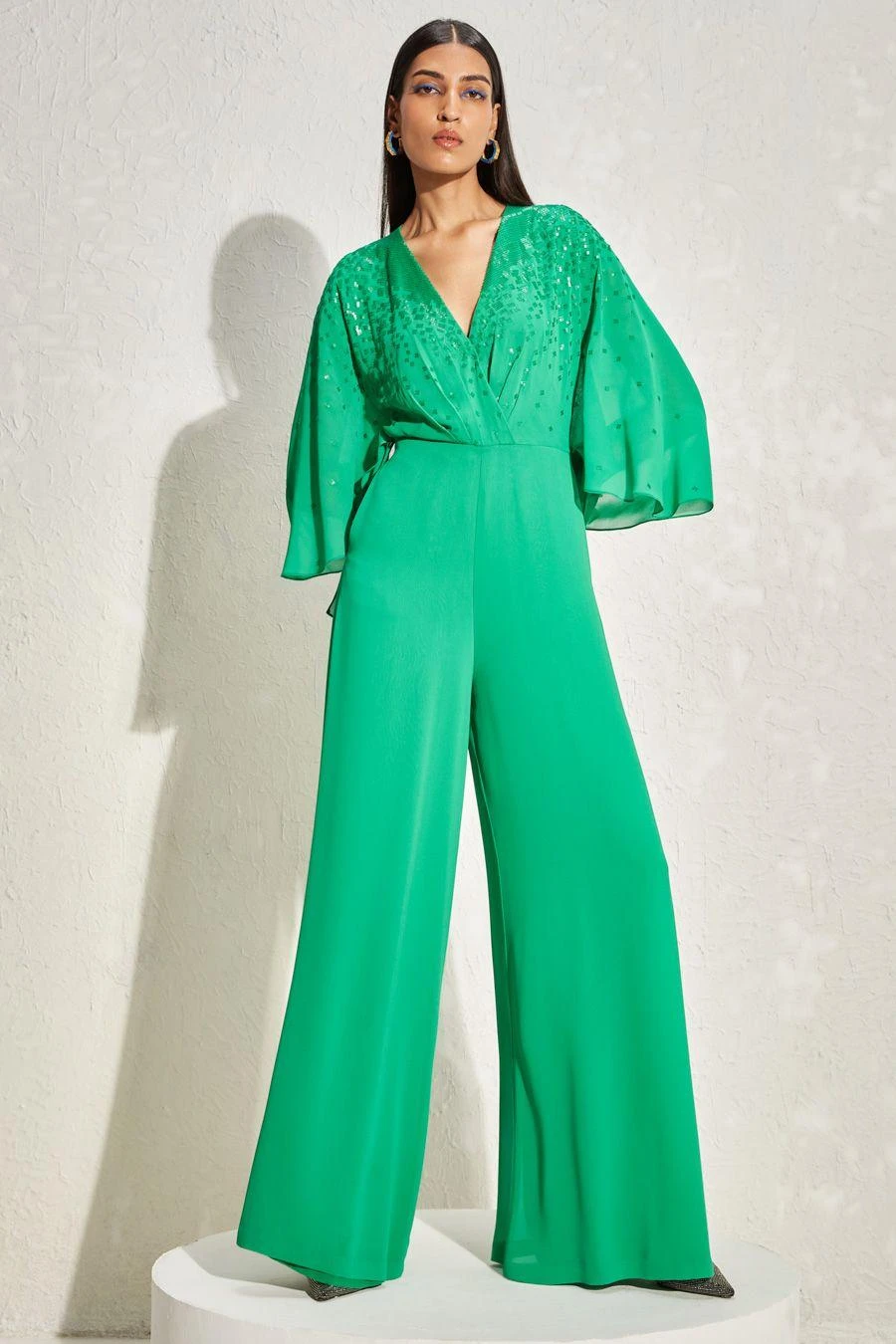 Look effortlessly stylish with this kelly green jumpsuit. Crafted in georgette, this V-neck jumpsuit features geometric hand embellished details with batwing sleeves. Add a pair of dangler earrings to complete the look.